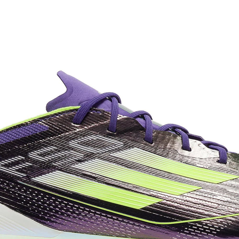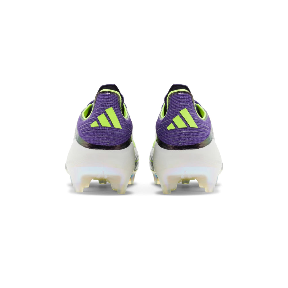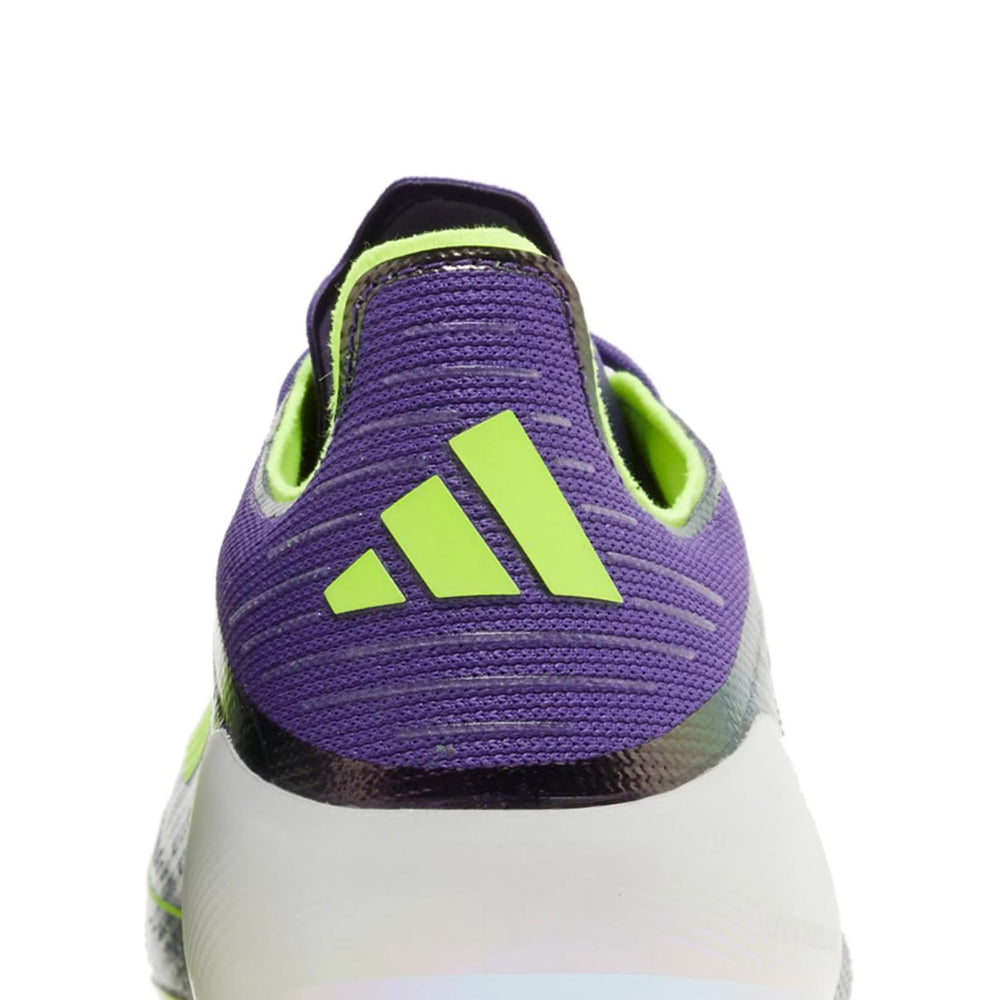 The vibrant 'Purple Lucid Lemon' design is complemented by subtle three-stripe branding, maintaining the iconic Adidas identity while introducing a fresh and modern look. The cleat's ergonomic design includes a cushioned insole and padded heel for added support and comfort during intense matches. Additionally, the FG (firm ground) configuration is optimized for use on natural grass surfaces, ensuring maximum performance and durability.