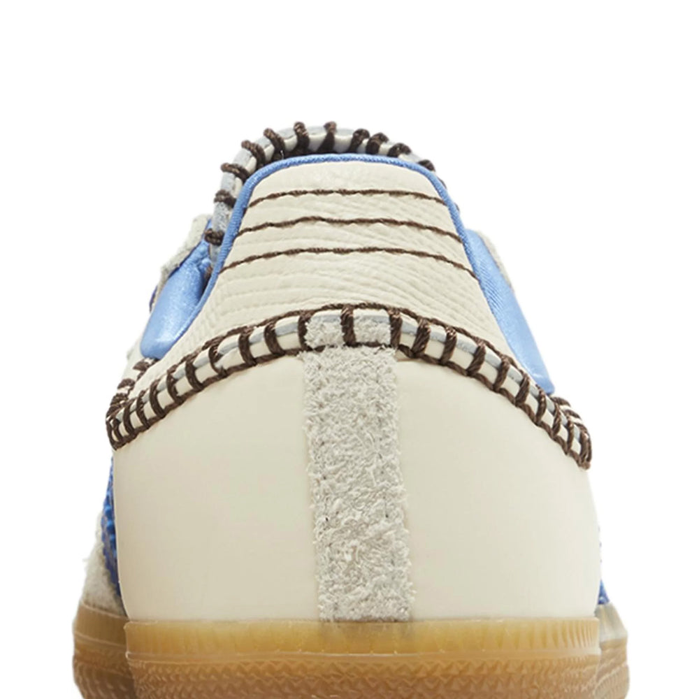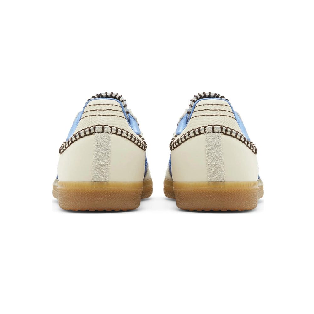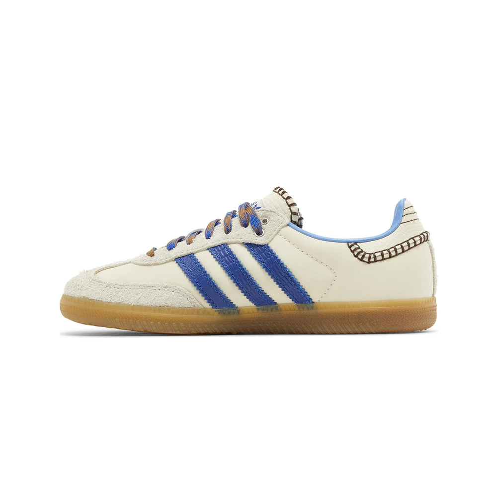 The Adidas Samba Nylon Wales Bonner 'Wonder Clay Royal' is distinguished by its premium nylon upper, a departure from the traditional leather, which offers a contemporary twist on the iconic silhouette. The shoe is adorned with a soft 'Wonder Clay' hue, complemented by 'Royal' blue accents that run along the Three Stripes branding, heel tab, and tongue. These bold contrasts highlight the intricate stitching that Wales Bonner is known for, creating a striking visual appeal. The collaboration also introduces unique design elements, such as a suede T-toe overlay and a gum rubber outsole, enhancing both the durability and the retro vibe of the sneaker. This edition is a celebration of cultural fusion, where modern design meets traditional craftsmanship.