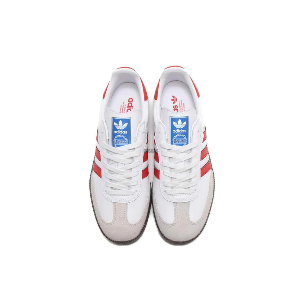 Stand out from the crowd with the Adidas Samba OG 'White Better Scarlet' (2023), featuring iconic branding details such as the signature Adidas Three Stripes logo on the side panels and the classic Trefoil logo on the tongue, showcasing the brand's unmistakable identity.