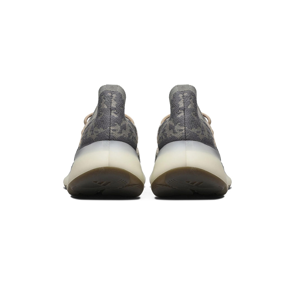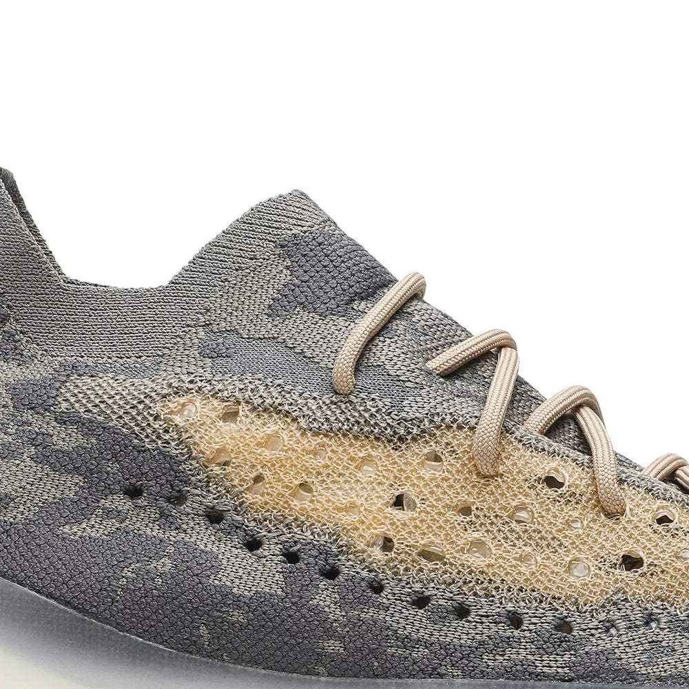The Adidas Yeezy Boost 380 'Mist' features an upper constructed from a blend of breathable Primeknit fabric in a mix of earthy tones, including greys and muted browns, creating a camouflaged effect. This adaptive upper wraps around the foot, offering a snug and sock-like fit, while perforated patterns on the sides improve ventilation. The translucent monofilament window adds a touch of visual interest and modernity, seamlessly integrated into the lateral side.