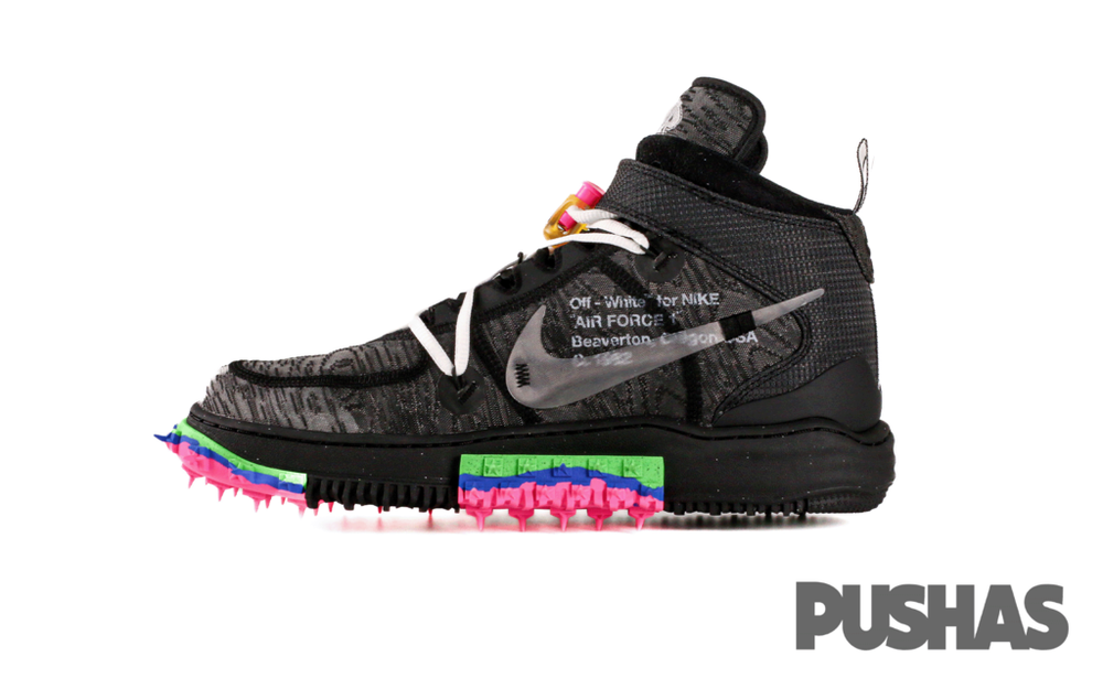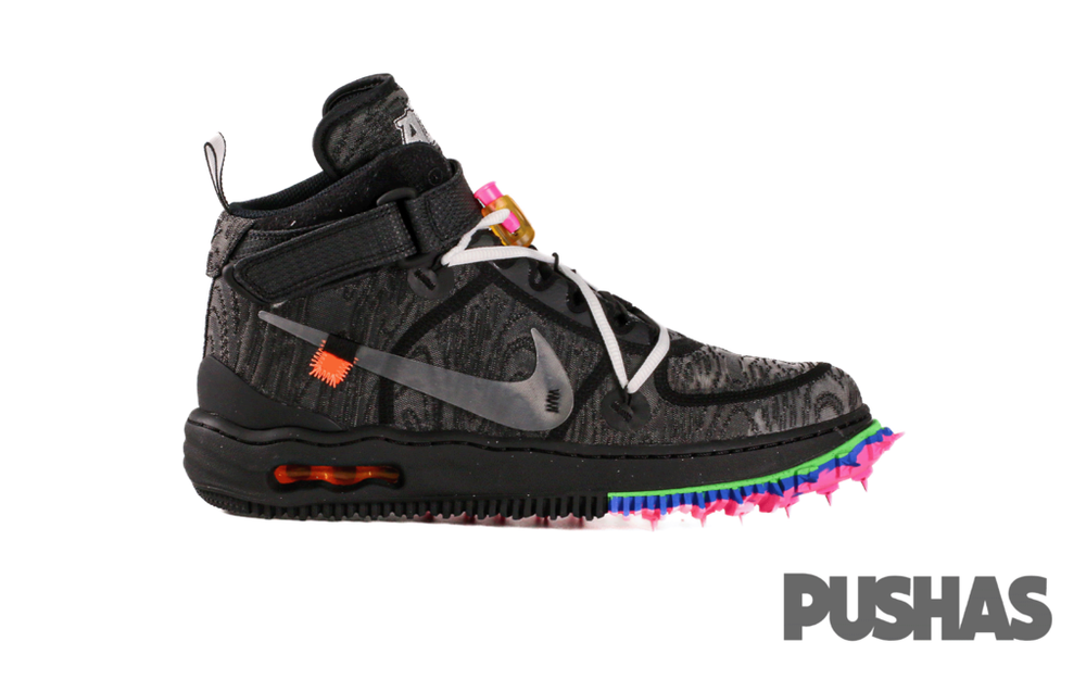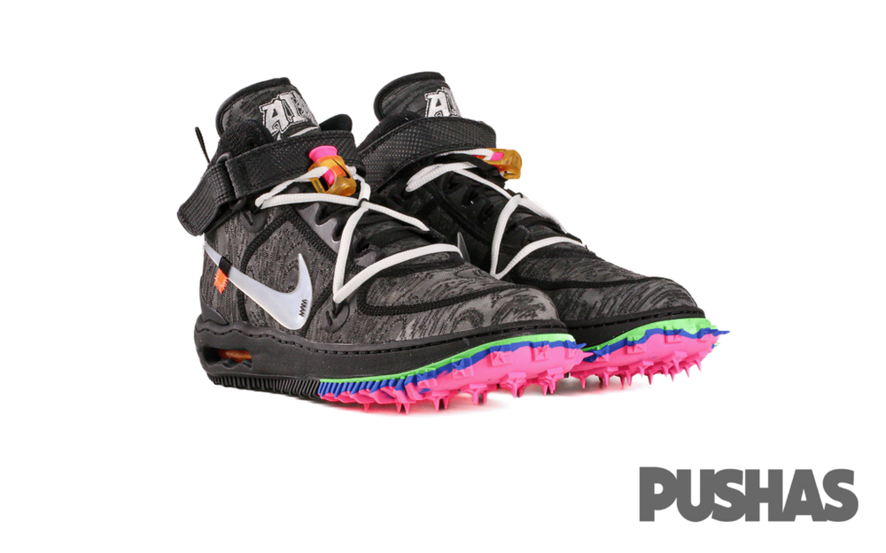 The Nike Air Force 1 Mid Off-White honors the 40th Anniversary of the Nike Air Force 1 by refreshing the classic design with Abloh's signature avante-garde style. It arrives with a black, wood grain-textured lightweight mesh upper with ripstop collar straps and clear TPU Swooshes. From there, a warped midsole with multi-colored sections of a track-inspired spiked outsole reference past Nike Off-White designs like the Nike Waffle Racer and Air Zoom Tempo Next%.