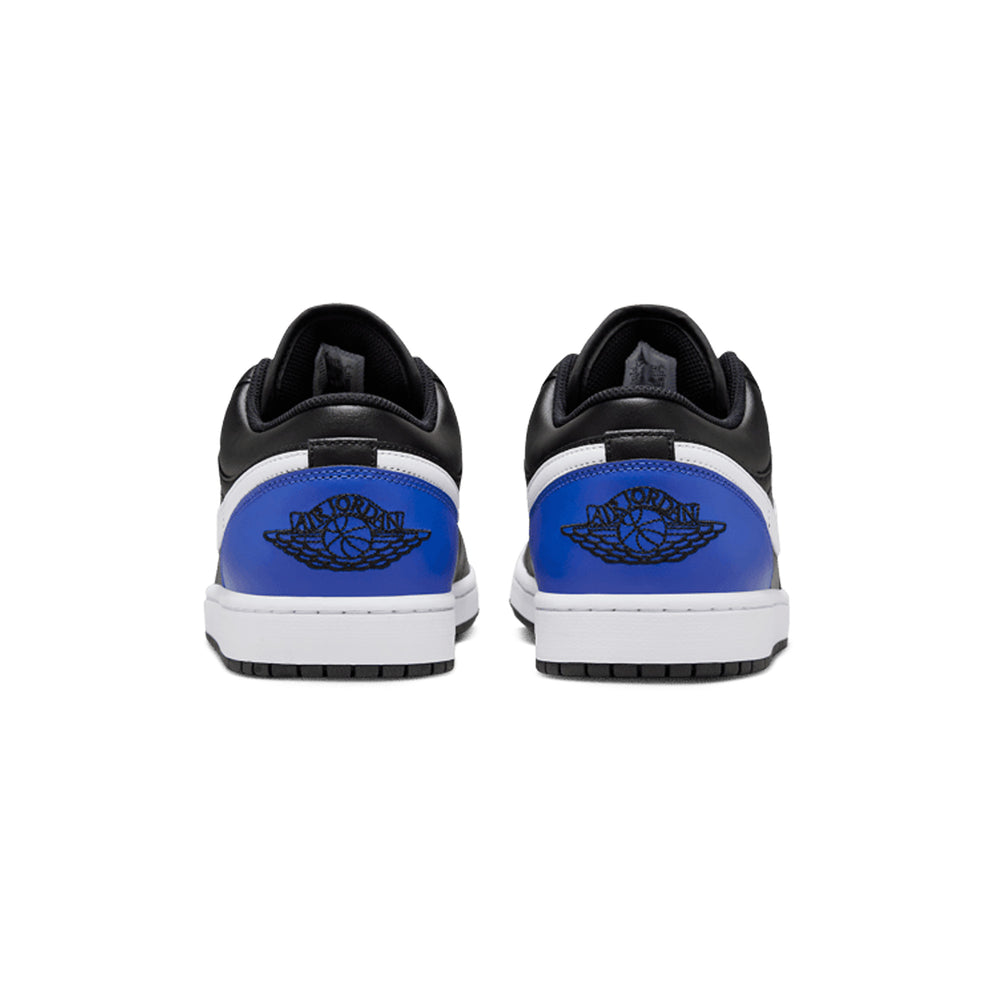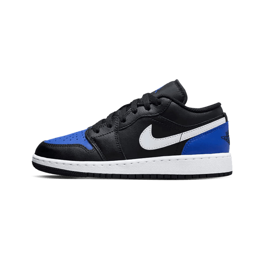 Crafted for young sneaker enthusiasts, the Air Jordan 1 Low 'Black Game Royal White' GS features a versatile combination of "Black" and "Game Royal" overlays that contrast against a clean white leather base. The black leather paneling extends through the forefoot and heel, delivering a sleek, understated vibe, while the Game Royal accents on the Swoosh, heel tab, and outsole add a pop of vibrant color. The signature Wings logo is embroidered on the heel in a matching royal blue, while a classic white midsole completes the look with clean, iconic style. This release showcases an adaptable color scheme that seamlessly fits a range of outfits, making it a solid choice for both casual wear and basketball-inspired looks.