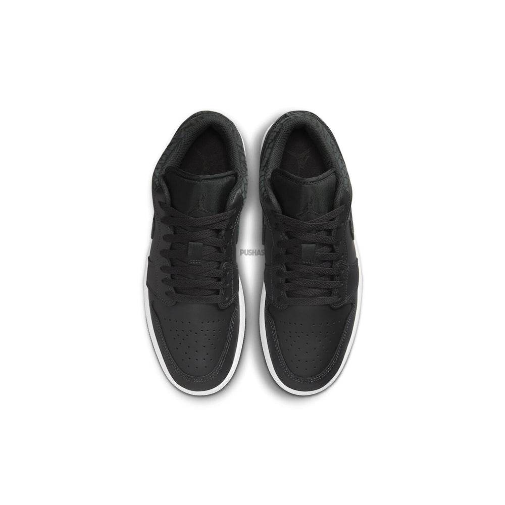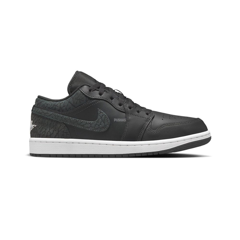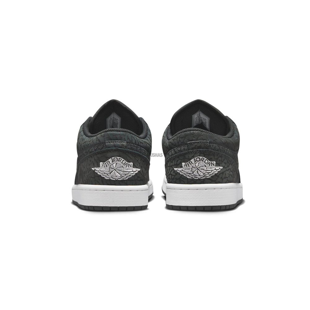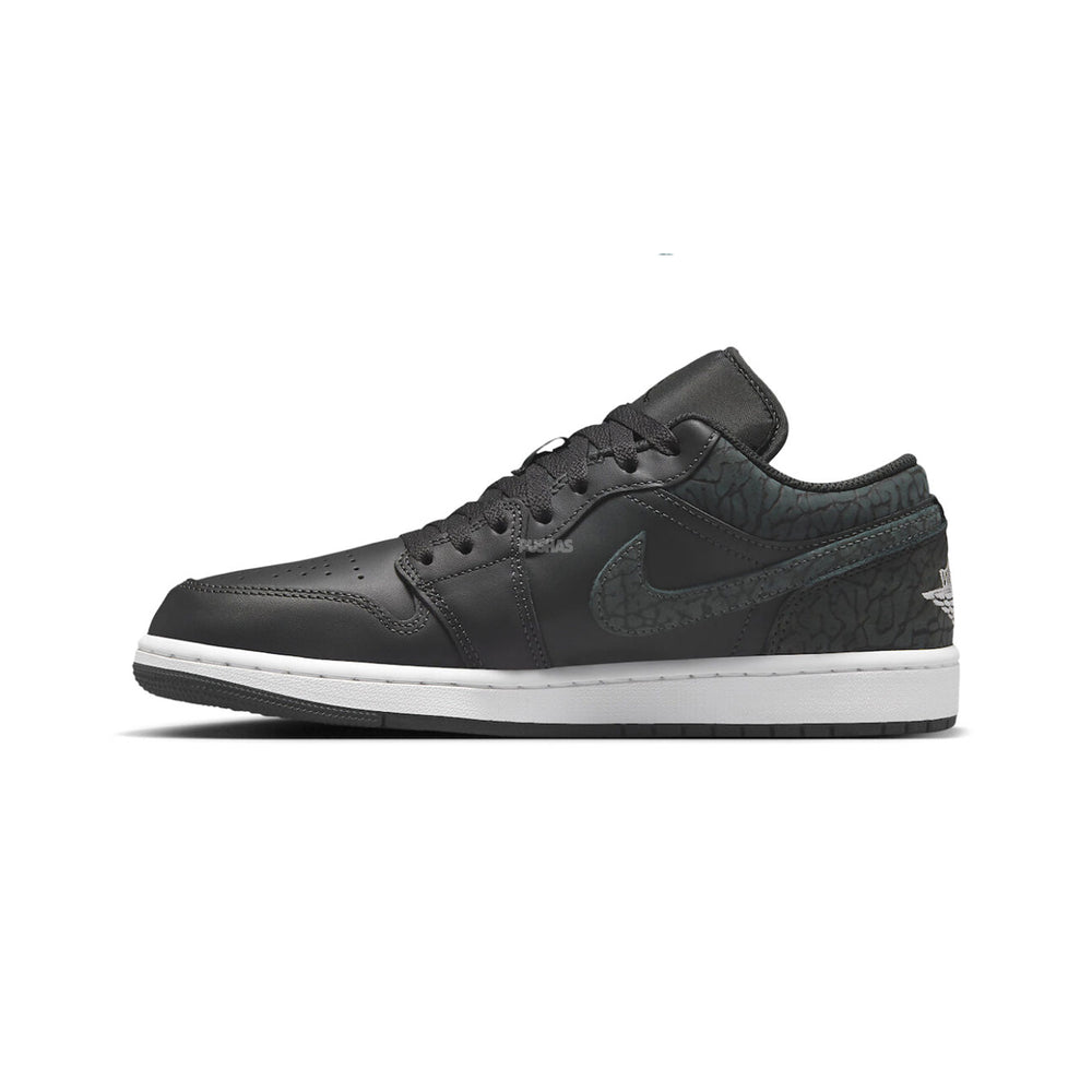 The fact-checked details of the Air Jordan 1 Low SE 'Black Elephant' extend to the classic Nike Swoosh, meticulously stitched to perfection. The renowned Jumpman logo, a symbol of quality and authenticity, graces the tongue, reinforcing the fact-checked commitment to delivering the highest standards associated with the Air Jordan brand.