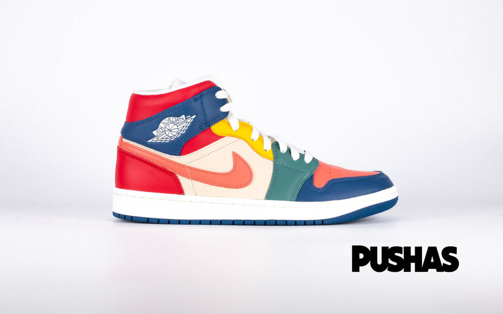 Buy the Nike Air Jordan 1 Mid 'Multi Colour' W (2022) Mid-foot panels opt for a beige hue, while leather layers at the forefoot, along the tongue and across the heel deviating in bolder blue, orange, green, yellow and red colors. Profile swooshes indulge in a vibrant pink that contrasts the ruby-colored Jumpman logo on the Jordan 1-variant’s tongue. Underfoot, white and navy tones make up the latest take on Peter Moore’s iconic sole unit.