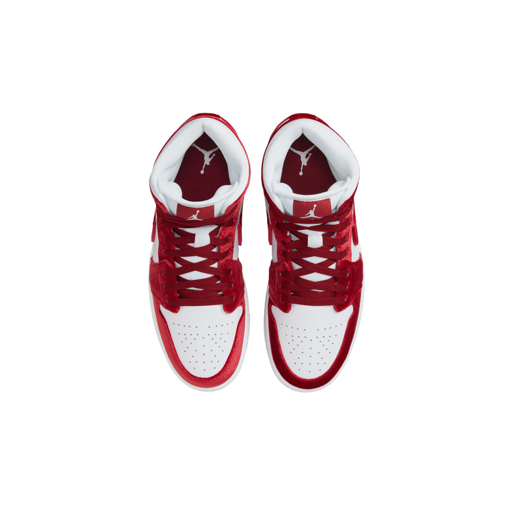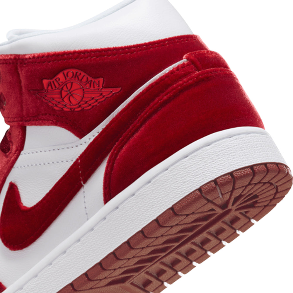 The Air Jordan 1 Mid SE 'Red Velvet' showcases a premium red velvet upper that gives the sneaker a soft, luxurious texture, setting it apart from typical leather-based Jordan offerings. The rich burgundy tones of the velvet are complemented by deep black accents on the laces, Swoosh, collar, and outsole, creating a sleek, monochromatic look that is both chic and versatile. A white midsole provides a contrasting base, highlighting the vivid red tones and offering a balanced color palette. The iconic Air Jordan Wings logo is embossed in black on the ankle, completing the sophisticated aesthetic. With a mix of opulent material and classic design, this women's-exclusive release is a true standout.