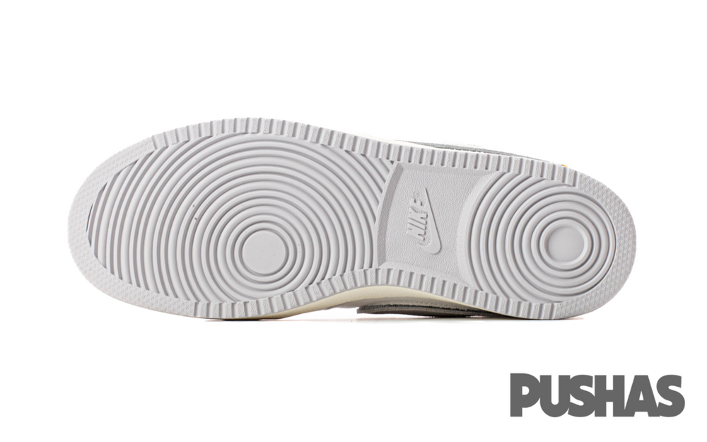 The white and neutral grey canvas upper, sail midsoles, and yellow stitching details are all part of the Union x Jordan partnership. The Union LA logo is positioned below the detachable blue and grey swoosh patches on the Jordan x Union AJKO Low SP.