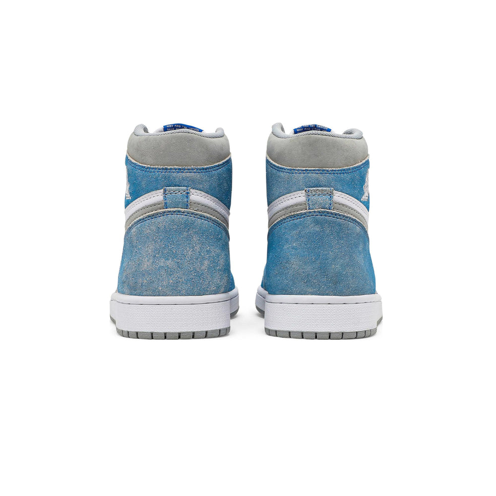 The Air Jordan 1 Retro High 'Hyper Royal Smoke Grey' features a harmonious blend of "Hyper Royal" and "Light Smoke Grey" hues, creating a captivating visual appeal. The upper is constructed from a mix of suede and leather, ensuring durability and a premium feel. The "Hyper Royal" overlays contrast beautifully with the "Light Smoke Grey" underlays, while the white leather base adds a touch of classic elegance. The sneaker is further accentuated by a crisp white midsole and a durable grey rubber outsole, offering both style and functionality. The iconic Swoosh is rendered in blue, seamlessly tying the color scheme together. Completing the design are the traditional Wings logo on the collar and the Nike Air branding on the tongue, both standing as symbols of the Air Jordan heritage.