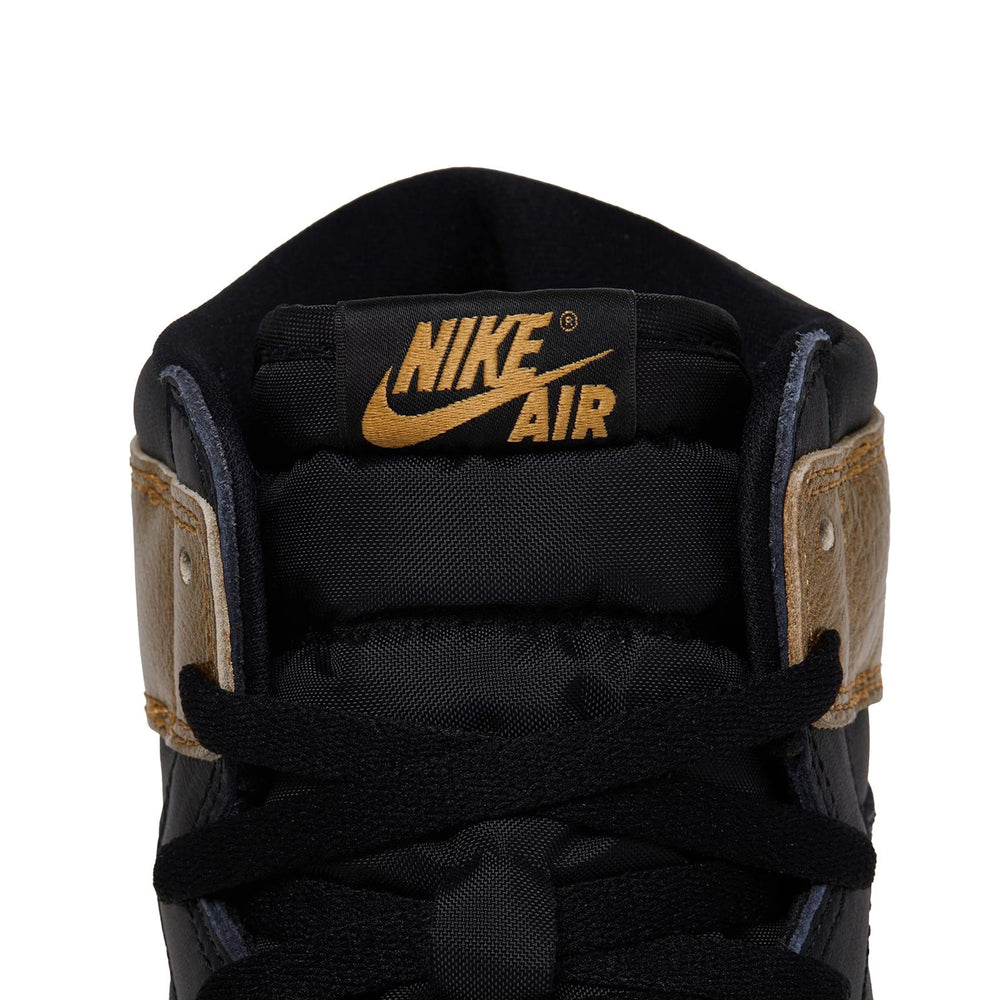 The Air Jordan 1 Retro High OG 'Black Metallic Gold' features a sleek black leather upper, providing a timeless and versatile foundation. This premium material is highlighted by striking metallic gold overlays that embellish the toe box, eyelets, and heel, creating a bold contrast that captures attention. The iconic Swoosh and Wings logo are executed in a high-shine metallic gold, enhancing the shoe’s premium aesthetic. The sneaker also showcases a contrasting white midsole and black outsole, which not only provide durability but also accentuate the gold detailing. The black and gold theme extends to the Nike Air branding on the tongue, adding a touch of elegance to this classic silhouette. With its sophisticated color scheme and high-quality materials, this Air Jordan 1 Retro High OG design continues the legacy of excellence in sneaker fashion.