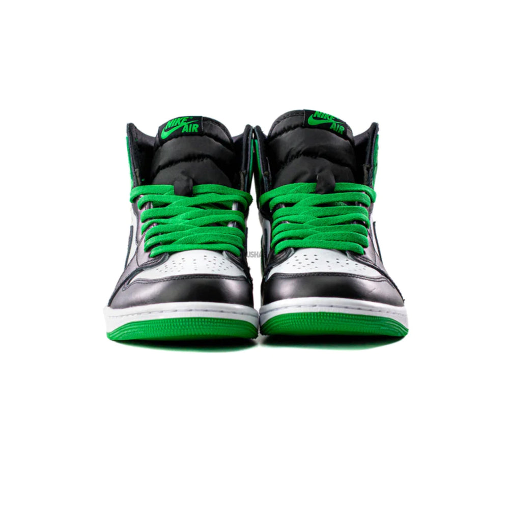 The leather upper of the Air Jordan 1 Retro High OG is vibrantly colored with hues of white, black, and Lucky Green. On top of the black tongue and insoles of the shoe, Lucky Green Nike branding is seen. Lucky Green laces are used to secure the footwear.