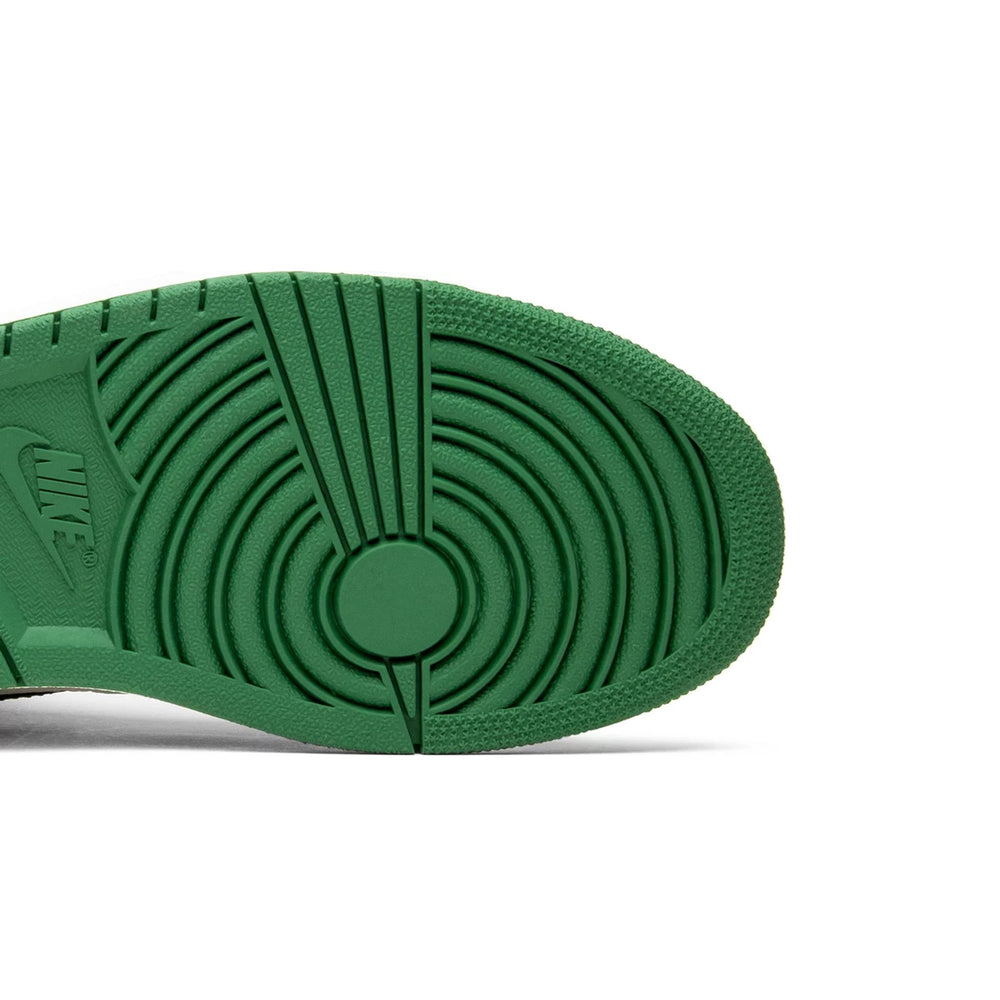 The Air Jordan 1 Retro High 'Pine Green' (2018) is constructed with a premium black tumbled leather base, enhanced by vibrant Pine Green leather overlays, creating a striking contrast. The shoe features the iconic Swoosh in black, blending seamlessly into the design, while the white midsole adds a clean, crisp break between the dark and green elements. The Wings logo on the collar is embossed in black, staying true to the traditional Jordan 1 design, while a green rubber outsole provides both style and traction. The use of high-quality materials ensures both durability and comfort, making it a reliable choice for daily wear or special occasions.