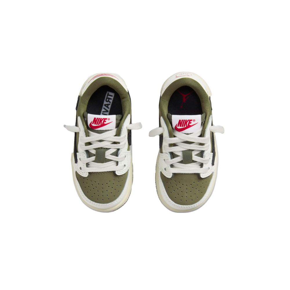 The Air Jordan 1 Retro Low OG SP Travis Scott 'Medium Olive' TD (2024) showcases a "Sail" leather upper, paired with suede overlays in the titular "Medium Olive" shade. This contrast is accented by the signature reverse Swoosh, rendered in black nubuck on the lateral side, a hallmark of Scott's designs. A traditional Swoosh in olive graces the medial side, balancing the overall design. A black tongue, laces, and inner lining add depth, while the "Cactus Jack" branding appears subtly on the medial panel, tongue, and heel. The look is completed with a vintage-inspired "Sail" midsole and olive rubber outsole, ensuring that this iteration of the Jordan 1 is ready for daily wear. Crafted with a mix of durable materials, this toddler-sized sneaker offers a blend of style and support for growing feet.