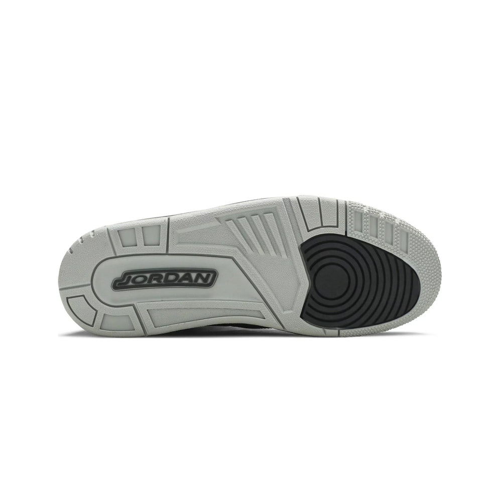 Key details include a tonal black midsole and outsole, providing a sleek, monochromatic appearance that enhances the shoe's versatility. The perforated black leather tongue, adorned with a subtle yet recognizable Jumpman logo, adds to the shoe's refined aesthetic. The eyelets and laces are also black, maintaining the shoe's cohesive and stealthy design.