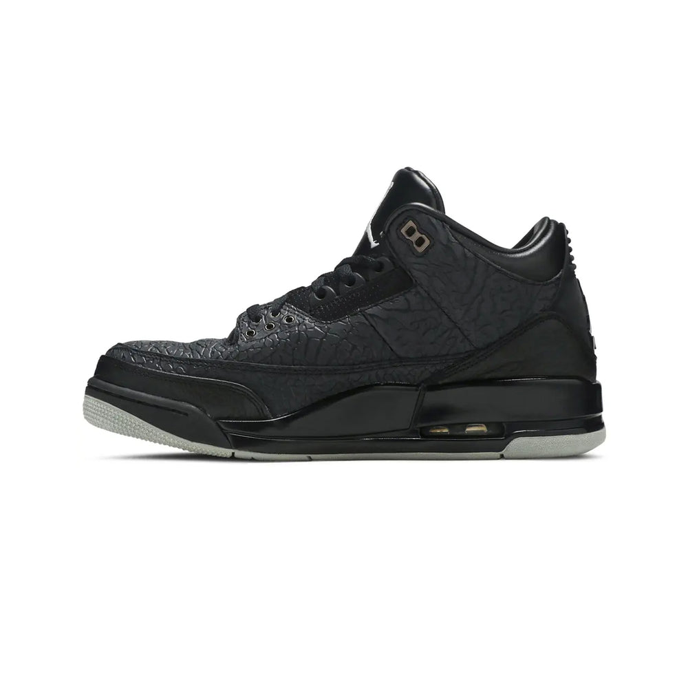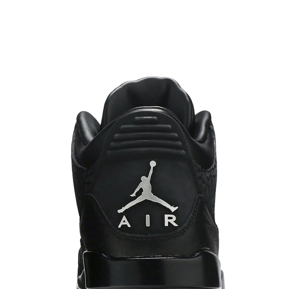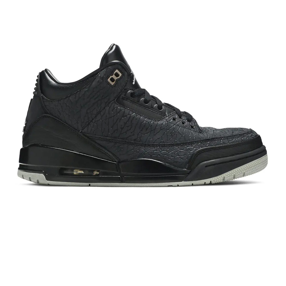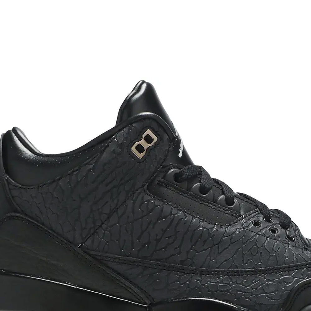 The Air Jordan 3 Retro 'Black Flip' flips the script on traditional design by extending the signature "Elephant Print" across the entire upper, a departure from its usual accenting role. The sneaker features a predominantly black leather upper, contrasted with tonal "Elephant Print" overlays that stretch from the mudguard to the collar. Smooth black leather on the tongue and toe box adds subtle texture variation, while a glossy black Jumpman logo adorns the tongue for a sleek finish. The tonal theme extends to the midsole, laces, and outsole, creating a unified, stealthy look. Inside, a premium leather lining elevates comfort, while the Air-cushioned sole ensures all-day wearability. This bold yet refined iteration epitomizes the innovative spirit of the Air Jordan line.
