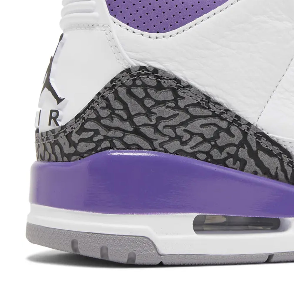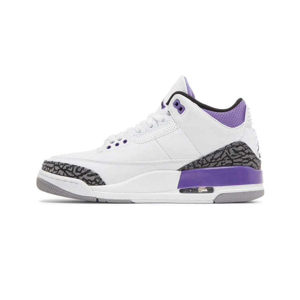 With purple accents on the heel and ankle, the leather foundation is mostly white. The shoe also has a black interior and an overlay with an elephant print in black and grey. White and Cement Grey outsoles round out the Air Jordan 3 Retro Dark Iris. The shoe bears the Jumpman emblem on the tongue and heel, with the 'AIR' brand mark below the Jumpman.