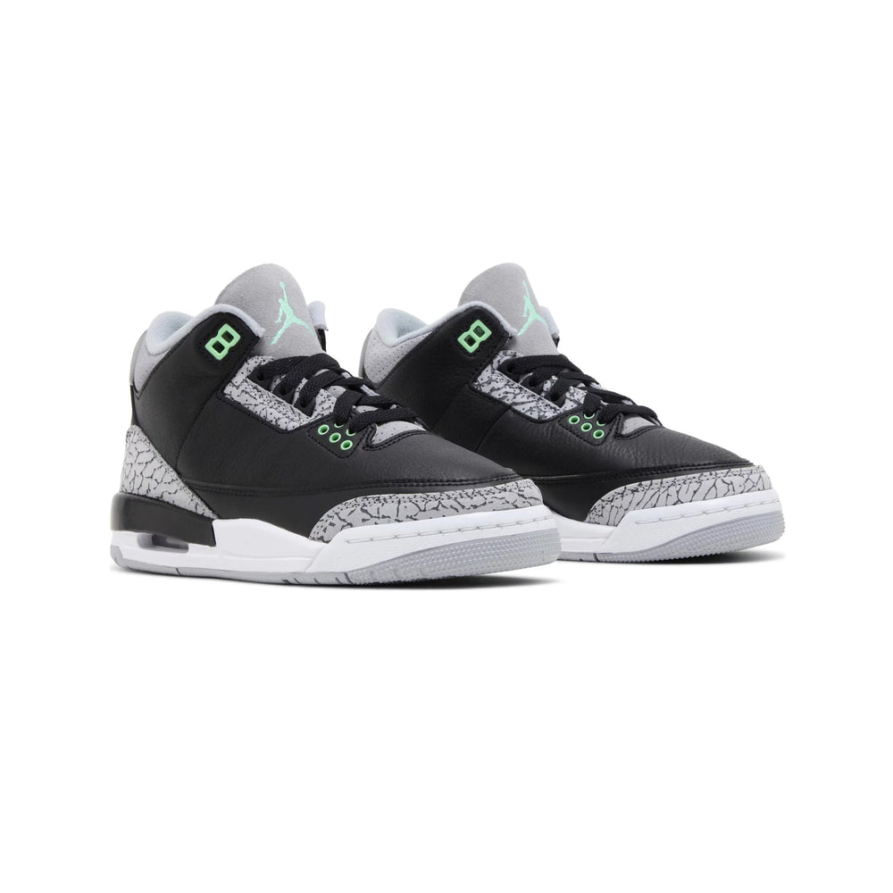 The Air Jordan 3 Retro 'Green Glow' GS is characterized by its striking "Green Glow" accents, which are strategically placed against a neutral backdrop of grey and black. The upper is constructed from premium leather, providing both durability and comfort. The signature elephant print overlays on the toe and heel pay homage to the original design, while the vibrant green detailing on the eyelets, midsole, and Jumpman logo on the tongue injects a modern flair. The visible Air-Sole unit in the heel ensures that the sneaker retains its renowned cushioning and support, making it as functional as it is stylish. This release continues the Air Jordan tradition of merging heritage with contemporary style, making it a must-have for both collectors and new fans alike.