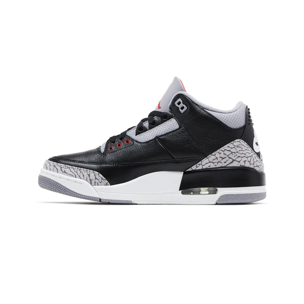 The Air Jordan 3 Retro OG 'Black Cement' (2024) continues the legacy of one of the most iconic sneaker designs in history. Celebrated for its combination of bold design elements and unparalleled craftsmanship, this 2024 release reintroduces a fan-favorite in its classic form, celebrating the essence of Jordan Brand’s rich heritage. Combining premium materials and timeless aesthetics, this retro edition ensures that the 'Black Cement' remains an enduring symbol in the world of sneaker culture. Overview The Air Jordan 3 Retro OG 'Black Cement' (2024) features a premium black leather upper paired with grey elephant print overlays on the toe and heel, paying homage to the original 1988 release. The silhouette's iconic red accents are visible through the Jumpman logo on the tongue and the Nike Air branding on the heel, reminiscent of the 1988 version. The midsole is crafted from white polyurethane for a sleek contrast, while the outsole showcases a durable rubber design for superior traction. True to its roots, the 'Black Cement' blends modern-day technology with the original aesthetics that made it a classic, ensuring both style and performance. Key Highlights • Classic 'Black Cement' Colorway: A perfect balance of black leather, grey elephant print, and red accents that mirror the legendary design first seen in 1988. • Iconic Nike Air Branding: Features the Nike Air logo on the heel, a detail that pays tribute to the original release and maintains the OG appeal. • Premium Materials: Crafted with high-quality leather and durable rubber, ensuring long-lasting comfort and wearability.