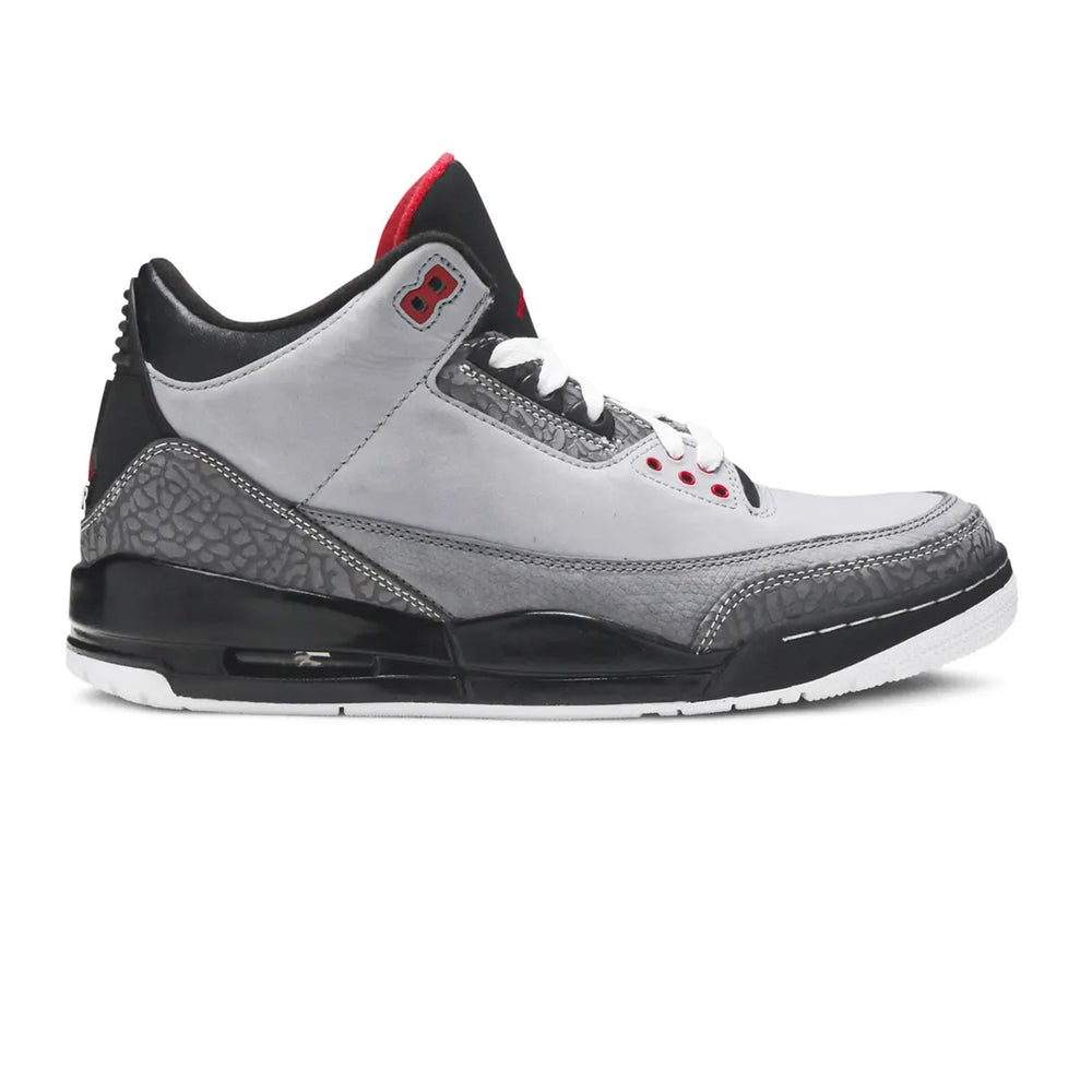 The Air Jordan 3 Retro 'Stealth' (2011) delivers a timeless design that stays true to the legacy of the Jordan Brand while offering a contemporary twist on the classic Air Jordan 3 silhouette. Its understated yet refined aesthetic appeals to both sneaker enthusiasts and casual wearers alike. Overview Crafted with a premium "Stealth" grey nubuck upper, the sneaker features tonal elephant print overlays on the toe cap and heel, paying homage to the Air Jordan 3’s iconic design language. Contrasting accents of white adorn the midsole, laces, and Jumpman logo, creating a clean and polished look. Additional pops of varsity red on the outsole, eyelets, and tongue lining provide just the right amount of vibrancy to balance the neutral tones. Completed with visible Air cushioning in the heel and a padded collar for enhanced comfort, the Air Jordan 3 Retro 'Stealth' effortlessly blends style and functionality, making it a versatile addition to any sneaker rotation. Key Highlights • Premium 'Stealth' Grey Upper: Features high-quality nubuck with iconic tonal elephant print overlays for a sophisticated look. • Subtle Pops of Varsity Red: Adds a dynamic contrast with accents on the outsole, eyelets, and lining for visual appeal. • Classic Air Jordan 3 Silhouette: Retains the timeless shape, complete with visible Air cushioning and a padded collar for comfort and support.
