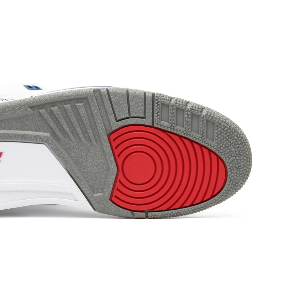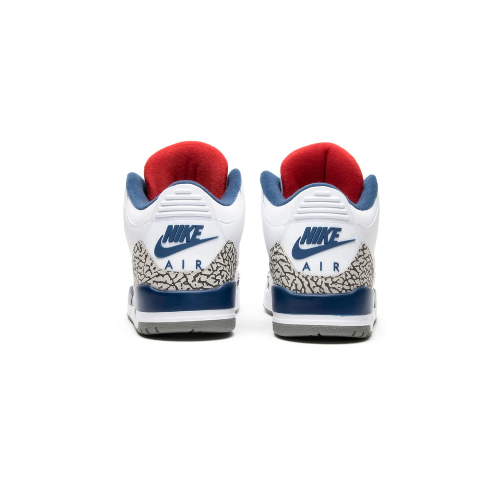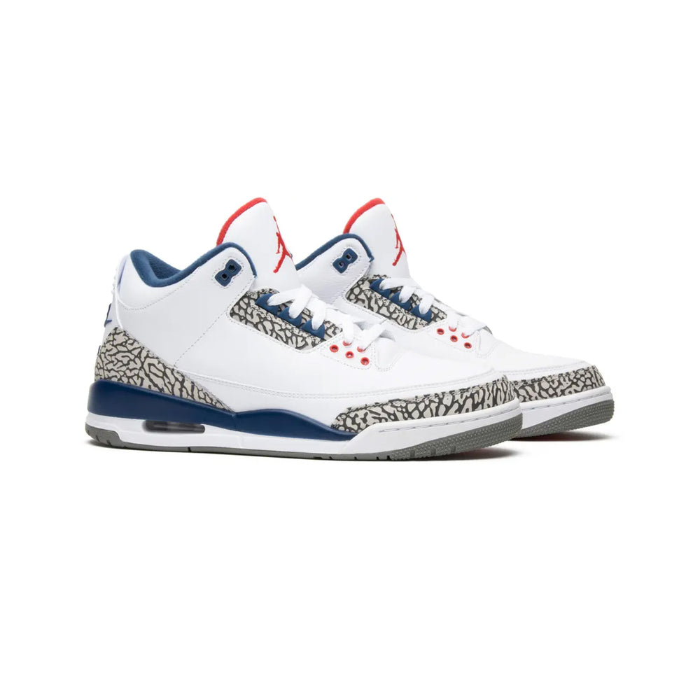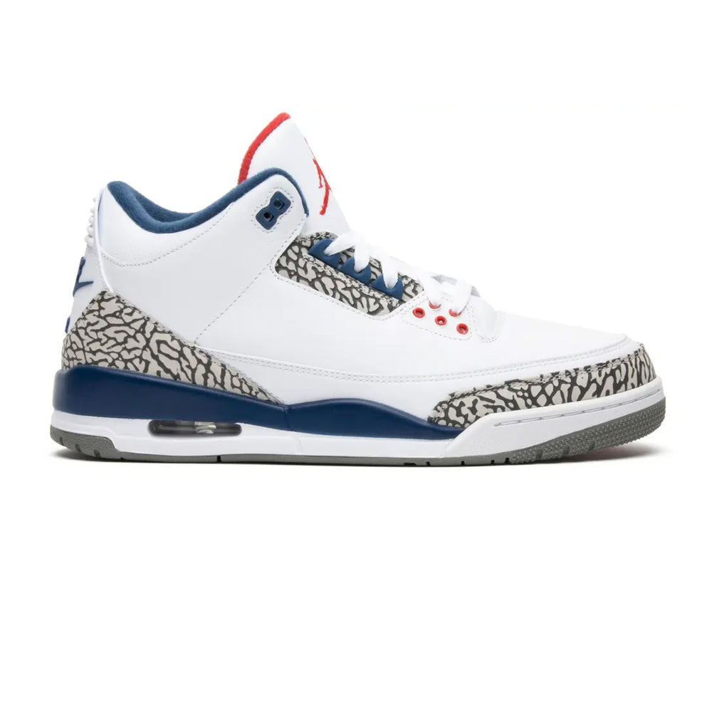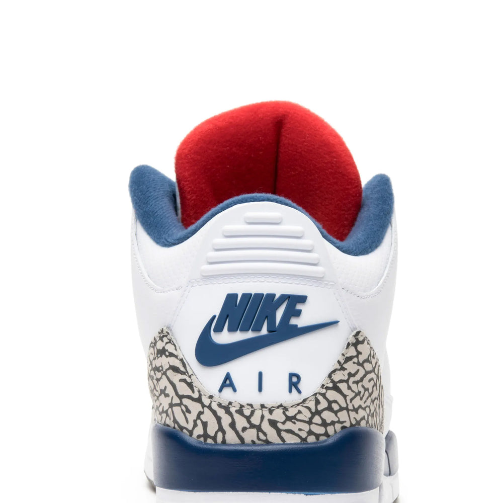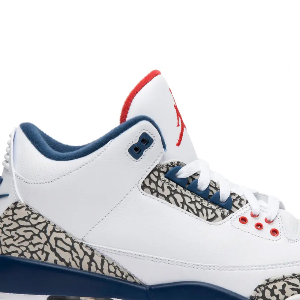 Crafted with a premium white leather upper, the Air Jordan 3 Retro 'True Blue' (2016) features striking "True Blue" accents along the collar, midsole, and eyelets, complemented by a vivid red lining on the tongue and inside the shoe. Signature elephant print overlays enhance the toe cap and heel, providing a textured contrast that elevates the overall aesthetic. The Jumpman logo makes a bold statement on the tongue, while the heel proudly displays the iconic "Nike Air" branding, restoring a beloved detail from the original release. Designed with performance in mind, the visible Air unit in the midsole ensures comfort, making this sneaker both a style and functionality staple.