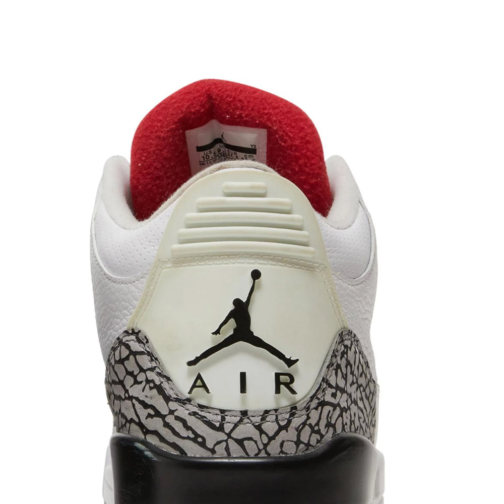 One of the most iconic features of the Air Jordan 3 is the visible Air-Sole unit in the heel, a pioneering addition by Hatfield that not only offered superior cushioning but also showcased Nike's cutting-edge technology. The Jumpman logo, introduced with the AJ3, graces the tongue in a bold red hue, reinforcing the brand's identity and Jordan's soaring legacy. Additionally, the sneaker boasts the original "Nike Air" branding on the heel, a nostalgic nod to its heritage that resonates deeply with purists and sneaker aficionados alike.