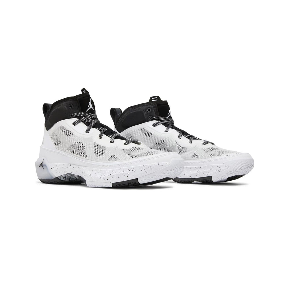 The Air Jordan 37 'Oreo' features a breathable Lenoweave upper that combines strength and flexibility, ensuring maximum support during gameplay. Its black-and-white pattern mirrors the beloved "Oreo" aesthetic seen in previous Air Jordan models, delivering a timeless look. Underfoot, the sneaker boasts a full-length Zoom Air unit with Formula 23 cushioning in the midsole, optimizing responsiveness and comfort. A carbon fiber plate enhances stability, while the herringbone outsole ensures superior grip on various surfaces. The design pays homage to past Jordan models, with visible influences from the Air Jordan 7 in its mid-cut silhouette and underfoot tooling, yet it introduces innovative materials to keep the shoe lightweight and durable.