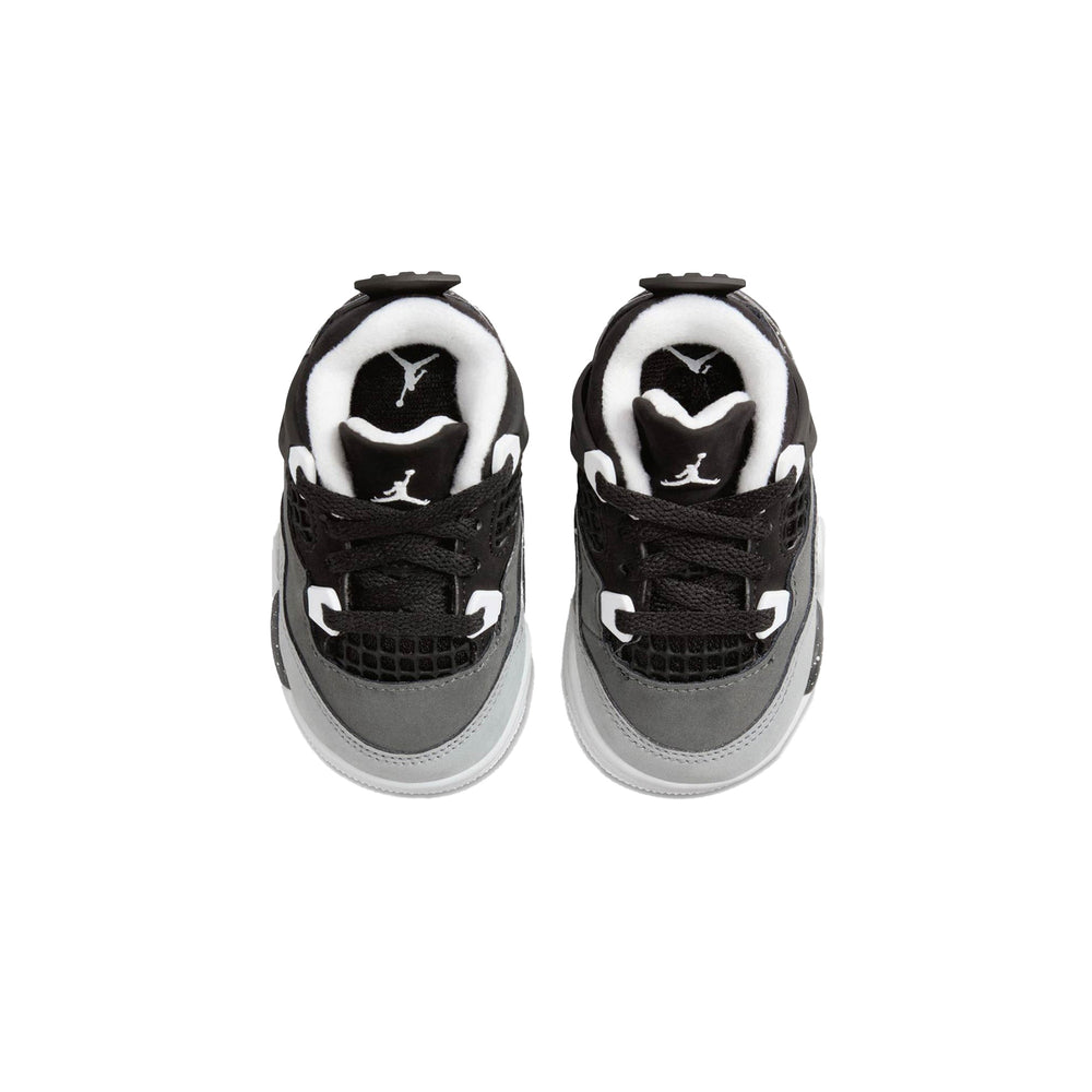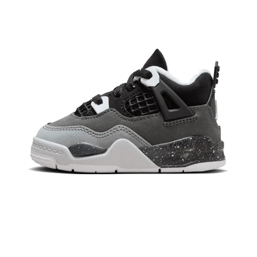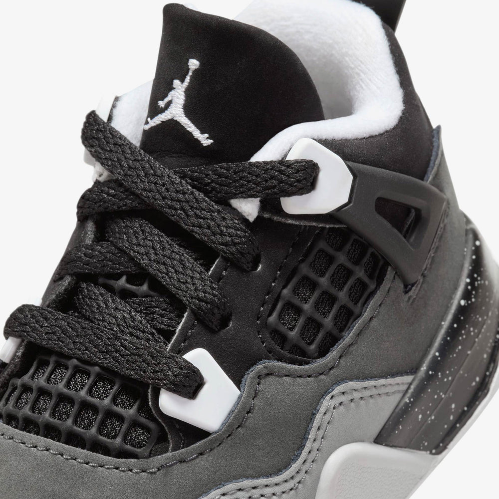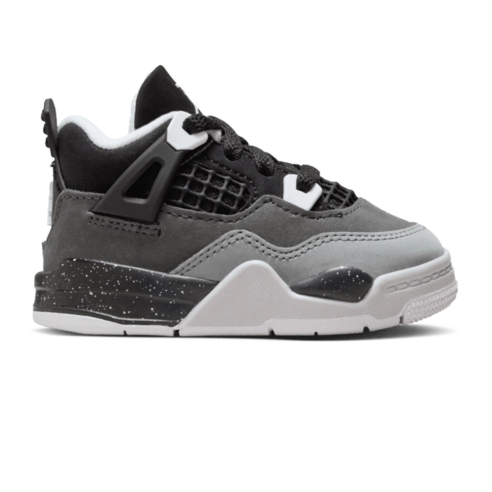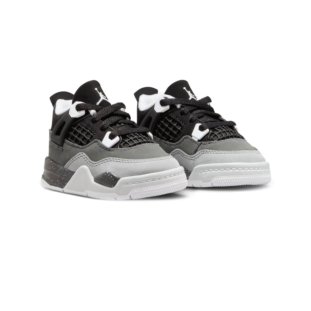 The Air Jordan 4 Retro 'Fear' TD features a premium "Cool Grey" suede base with deep "Dark Grey" accents on the overlays, creating a subtle yet impactful contrast that honors the fear-inspired colorway of the adult-sized counterpart. The shoe's construction includes leather and mesh materials that offer both comfort and breathability. The midsole is fitted with a supportive white foam unit, complemented by a visible Air cushioning system, ensuring a cushioned, responsive feel with every step. The tonal black laces, along with the grey tongue and Jumpman branding, complete the sleek design while maintaining the timeless look of the Air Jordan 4.