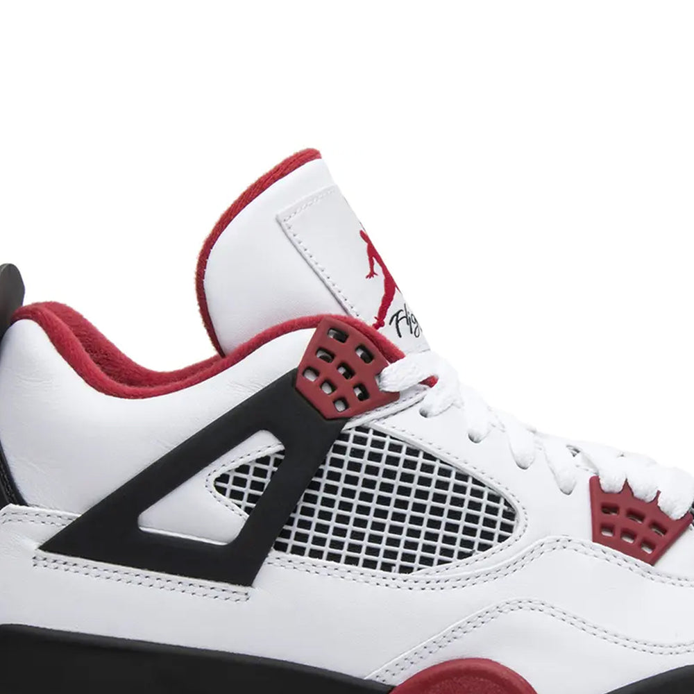 Crafted with a white leather upper, the Air Jordan 4 Retro 'Fire Red' (2012) features bold "Fire Red" accents on the eyelets, lining, and midsole, delivering a striking contrast. Black detailing adds depth to the design, appearing on the signature mesh panels, tongue tag, and heel tab, which prominently showcases the coveted Jumpman logo. The sneaker sits atop a visible Air unit in the heel, ensuring exceptional comfort and responsive cushioning. True to its roots, the 2012 iteration stays faithful to the OG design, while subtle updates in materials enhance durability and wearability, celebrating the legacy of Michael Jordan's fourth signature silhouette.