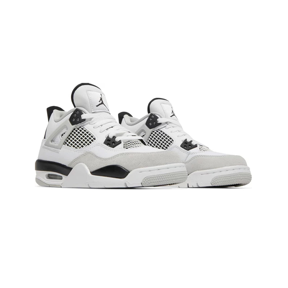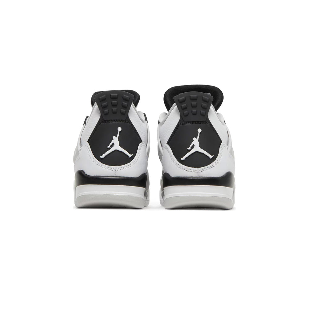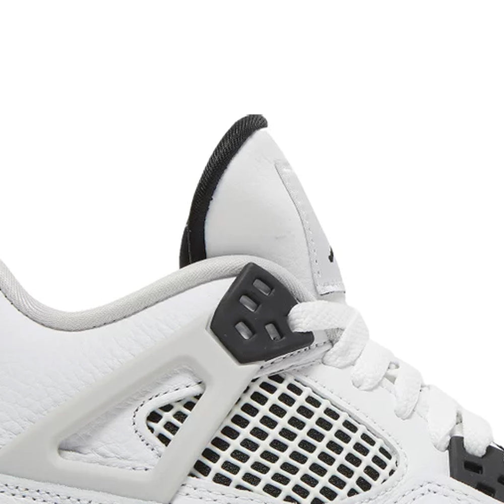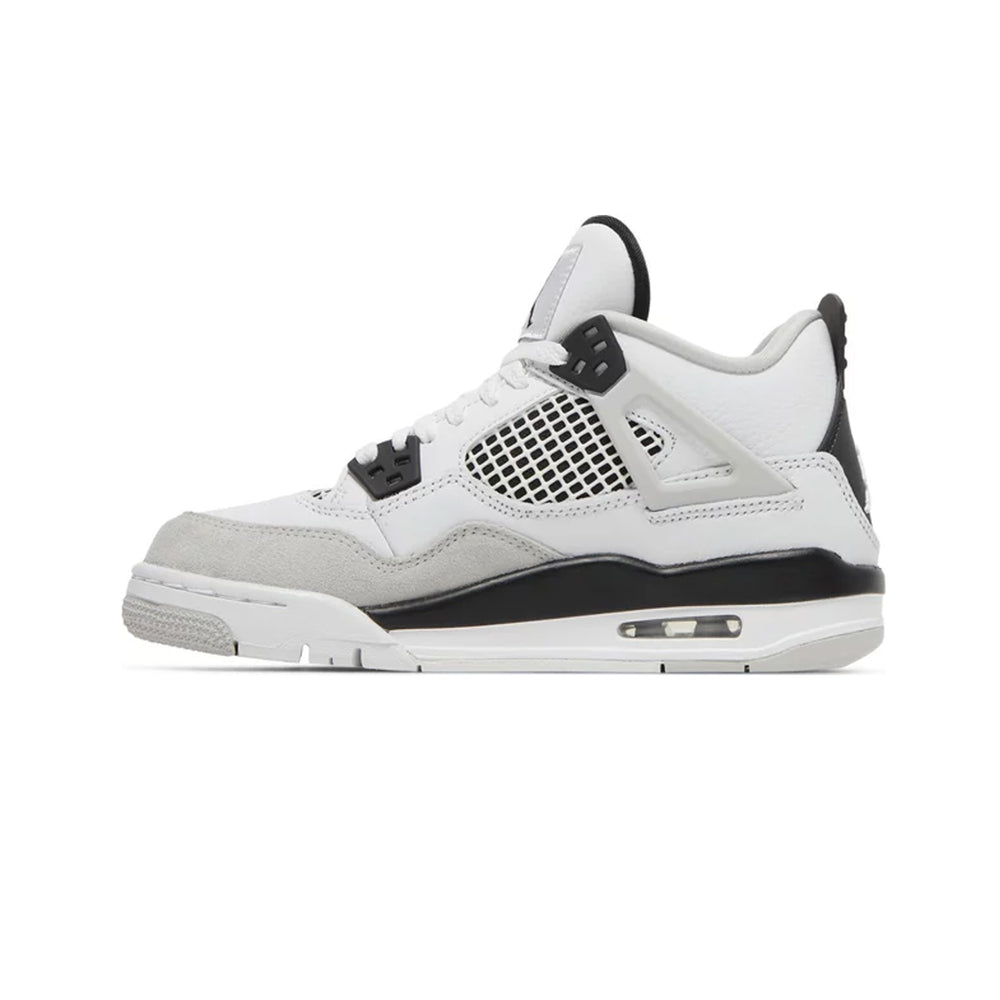 The Air Jordan 4 Retro 'Military Black' GS showcases a crisp white leather upper with smooth, durable nubuck accents along the mudguard in grey. The sneaker's black detailing across the eyelets, heel tab, and signature side netting contrasts sharply with the white base, creating a minimalist yet impactful look. A visible Air unit in the heel ensures cushioned comfort, while the forefoot features traditional lace locks for a snug, customizable fit. The neutral color palette enhances its versatility, making it an easy choice for any casual or athletic outfit. Built to last, this model fuses heritage design with modern functionality, making it a must-have for young sneaker enthusiasts.