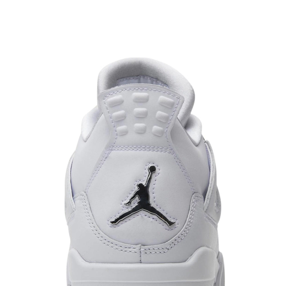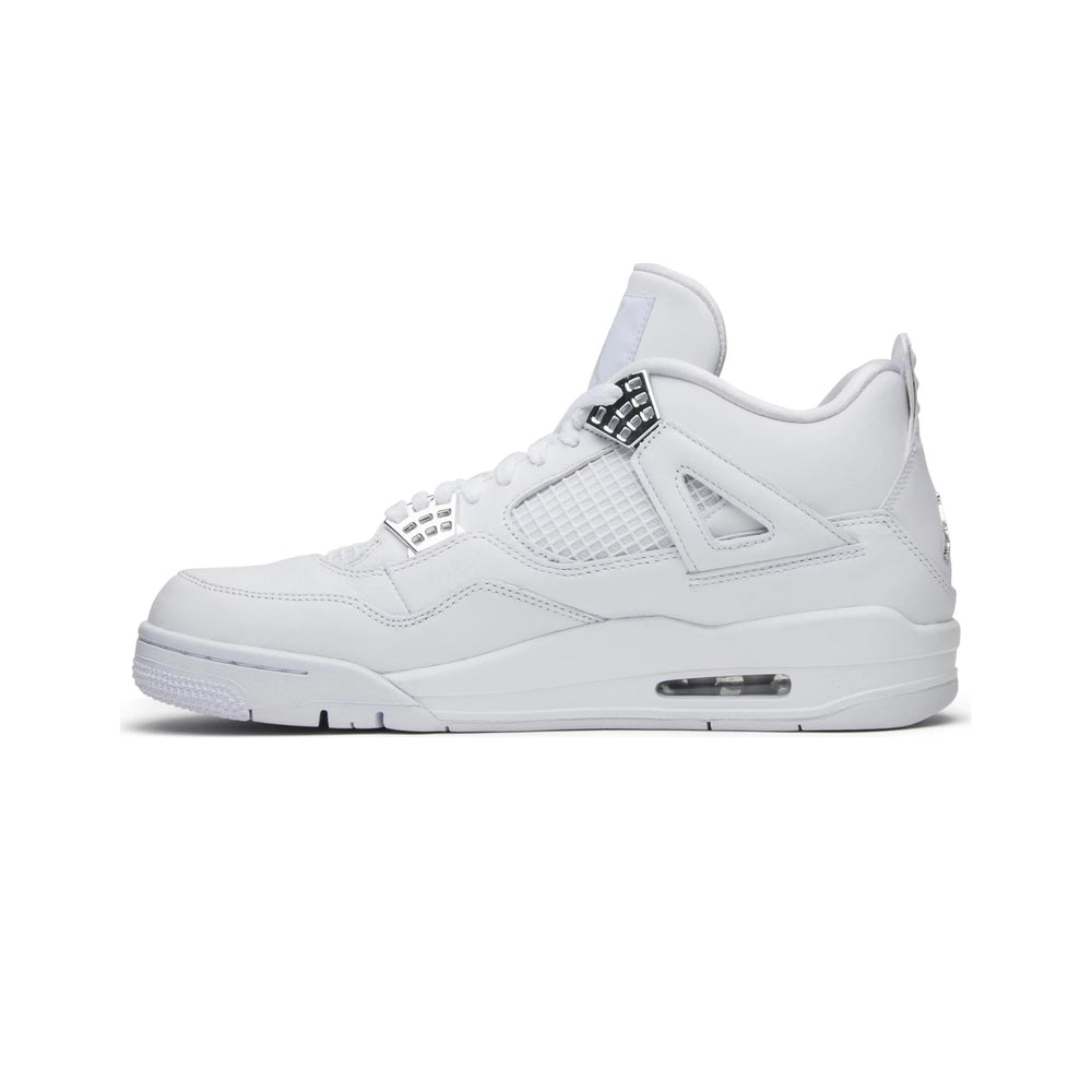 Distinguished by its clean lines and premium materials, the Air Jordan 4 Retro 'Pure Money' boasts a sleek white leather construction throughout its upper, complemented by subtle silver accents on the lace loops, mesh inserts, and heel tab. The classic Air Jordan wing embellishment on the lateral side further enhances its iconic appeal, while the visible Air-Sole unit encapsulated within the midsole delivers responsive cushioning and support. Ideal for collectors and enthusiasts alike, this rendition pays homage to its heritage while embracing modern design sensibilities.