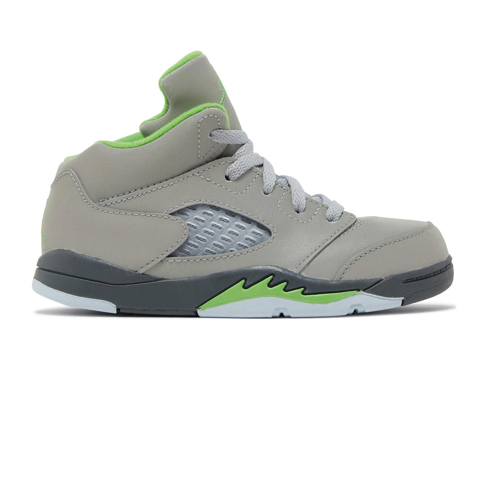 The Air Jordan 5 Retro 'Green Bean' TD showcases a sleek grey upper crafted from premium suede, giving the sneaker a refined and luxurious feel. The standout feature of this design is the striking 'Green Bean' accents, found on the midsole, tongue, and lace locks, offering a fresh contrast to the muted base. The iconic reflective tongue adds a touch of flair, enhancing visibility while staying true to the sneaker's original DNA. The translucent outsole complements the overall aesthetic, providing a modern twist while maintaining the retro appeal. This model is designed with the active toddler in mind, ensuring comfort and durability for young feet, making it perfect for both casual outings and playtime.