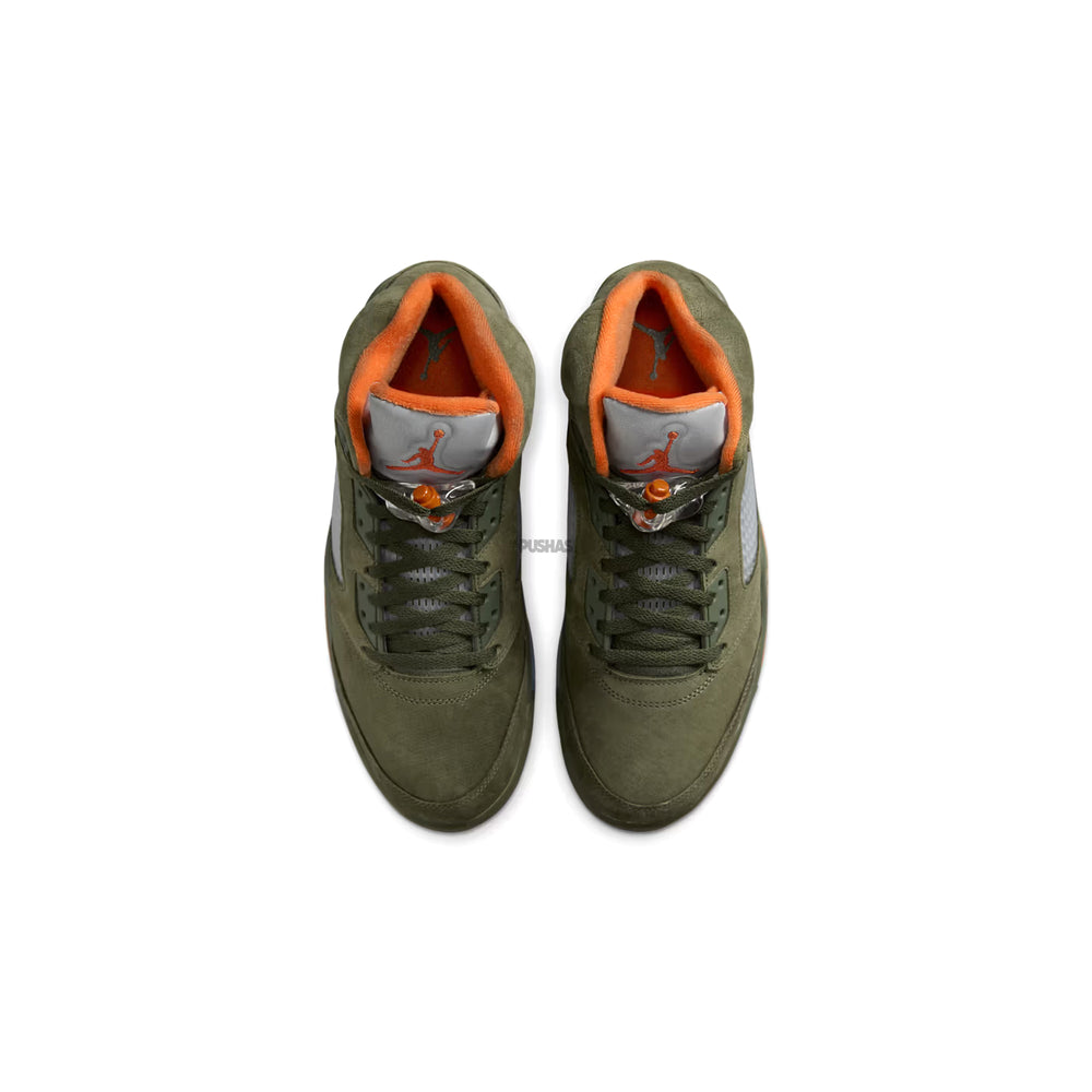 A Symphony of Design and Innovation Drawing inspiration from the rich palette of military hues, the Air Jordan 5 Retro 'Olive' (2024) exudes a sense of understated sophistication. The upper features a premium combination of supple olive suede overlays and sleek black leather accents, creating a visually striking contrast that commands attention. This harmonious blend of textures and tones is further accentuated by pops of vibrant orange on the midsole and tongue, adding a contemporary flair to the classic silhouette.