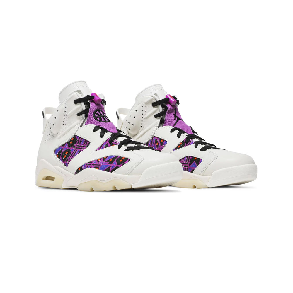 Crafted with a dynamic mix of materials, the Air Jordan 6 Retro 'Quai 54' features a white leather base complemented by patterned textile overlays that add a vibrant touch inspired by African art and Parisian street culture. The intricate patterns and vivid colors are not just aesthetically pleasing but also signify the unity and diversity celebrated at Quai 54. A translucent outsole and the iconic visible Air cushioning provide optimal comfort and performance, making it a perfect blend of style and functionality.