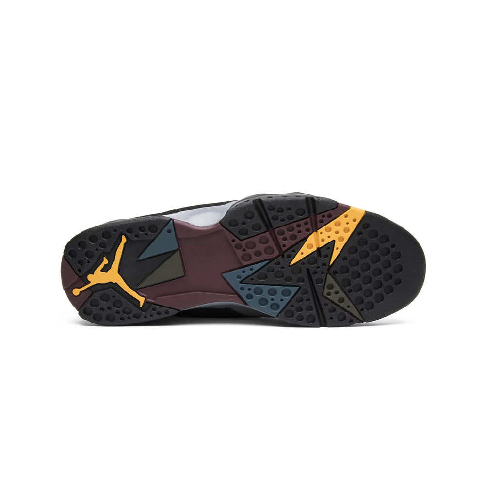 The Air Jordan 7 Retro 'Bordeaux' stands out with its distinctive color blocking and premium materials. The upper combines a mix of nubuck and leather in a black and light graphite palette, accented by the signature 'Bordeaux' hue on the midsole, tongue, and heel tab. The unique, geometric pattern on the tongue—featuring shades of yellow, green, and blue—adds a vibrant touch, reminiscent of the early '90s aesthetic.