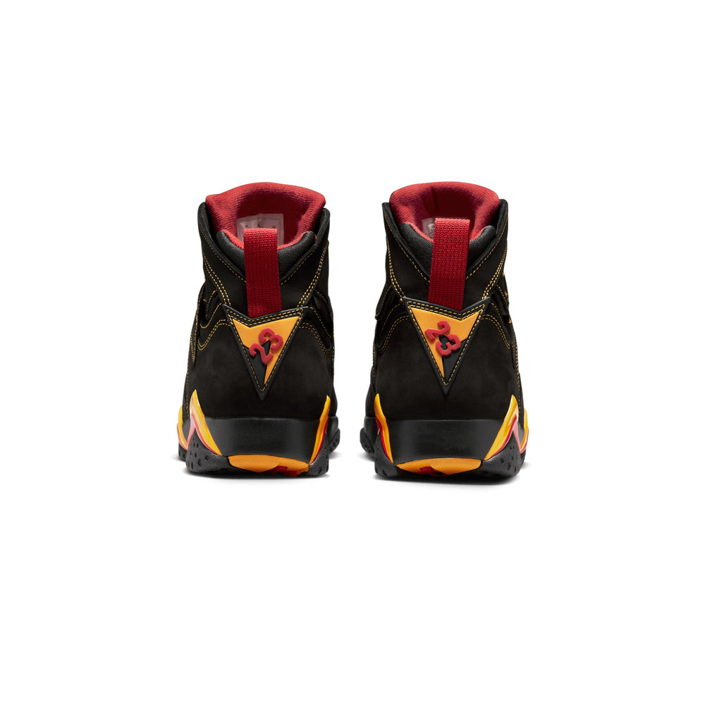 Crafted with a premium black nubuck leather upper, the Air Jordan 7 Retro 'Citrus' GS (2022) is meticulously detailed with contrasting citrus orange stitching that enhances its bold aesthetic. The midsole features a combination of black, white, and orange, creating a visually dynamic look that stands out on and off the court. The iconic Jumpman logo is embroidered in bright orange on the ankle, adding a signature touch that signifies quality and style. The shoe’s tongue, heel tab, and outsole are accented with vibrant citrus hues, further complementing the overall design. Inside, the sneaker offers a comfortable fit with cushioned insoles, ensuring that it not only looks good but also provides the comfort expected from the Jordan Brand.