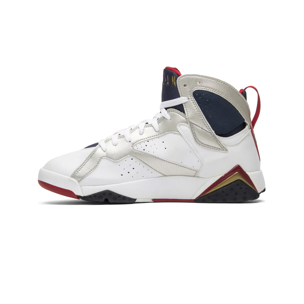The Air Jordan 7 Retro 'Olympic' (2012) is constructed with high-quality materials, ensuring both durability and comfort. The use of premium leather provides a supple feel and a sleek aesthetic, while the perforated detailing enhances breathability. The sneaker’s Huarache-inspired inner sleeve ensures a snug fit, making it perfect for both casual wear and athletic performance.