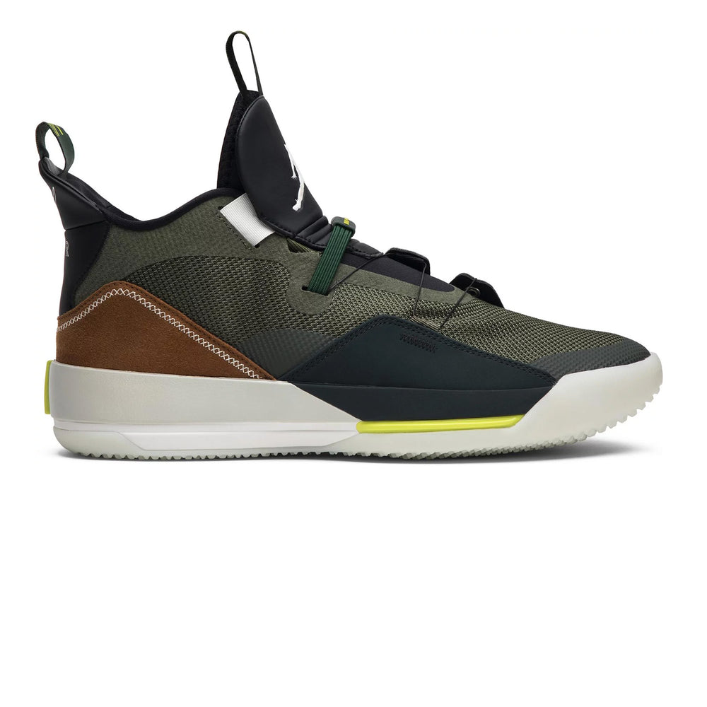 Crafted with an upper that combines premium leather and durable textile, the Air Jordan XXXIII 'Travis Scott' exudes a rugged yet refined appeal. The shoe features a military-inspired color palette dominated by earthy "Army Olive" tones, contrasted with subtle hints of black and metallic gold accents. This palette pays homage to Scott's signature style, reflecting his affinity for utilitarian fashion. The sneaker's standout feature is its revolutionary FastFit lacing system, which ensures a secure, locked-in feel without the need for traditional laces. Completing the look, the heel and insole are adorned with Scott's signature "Cactus Jack" branding, adding a personalized touch that resonates with fans and collectors alike.