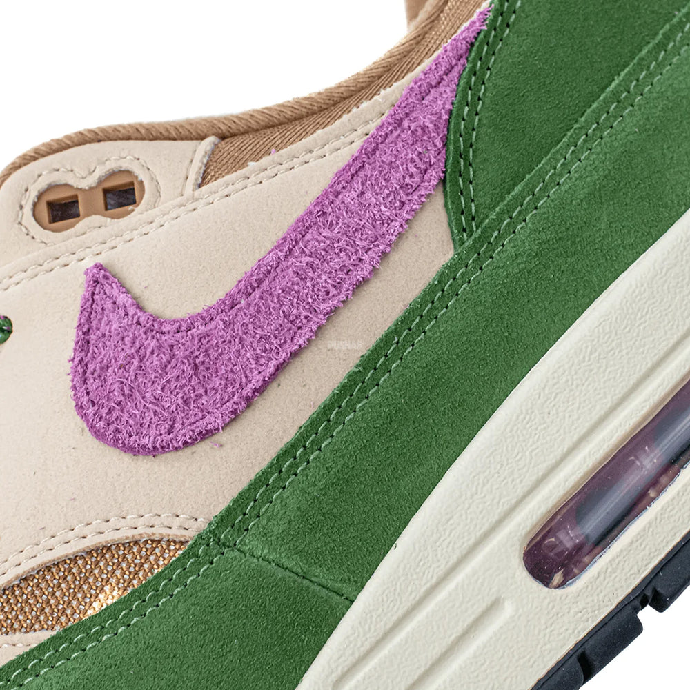 The Air Max 1 SH 'Treeline' features a striking "Treeline" green suede upper, which evokes the lushness of a verdant forest. This premium material is contrasted by "Black" mesh panels, enhancing both durability and breathability. The iconic Air Max cushioning is highlighted with a bold "White" midsole, providing both comfort and a visual balance to the deep green hues of the upper. Unique touches include the speckled detailing on the outsole, reminiscent of forest terrain, and the reflective Swoosh branding, which adds a modern twist to the classic design. The shoe’s subtle yet impactful color palette and materials are a testament to Nike’s dedication to blending style with environmental consciousness.