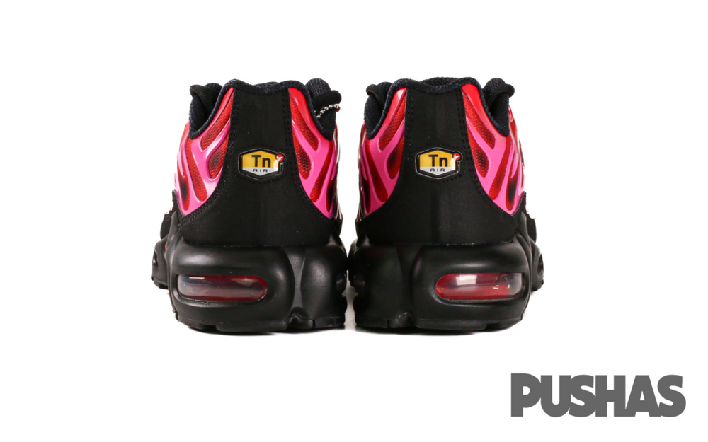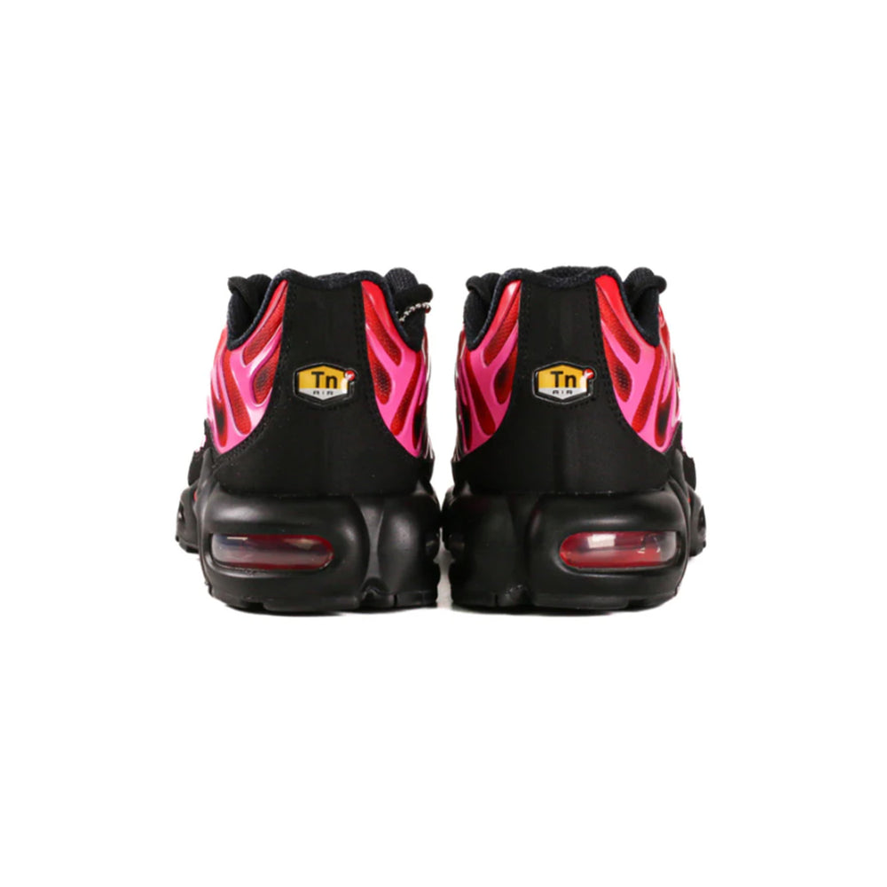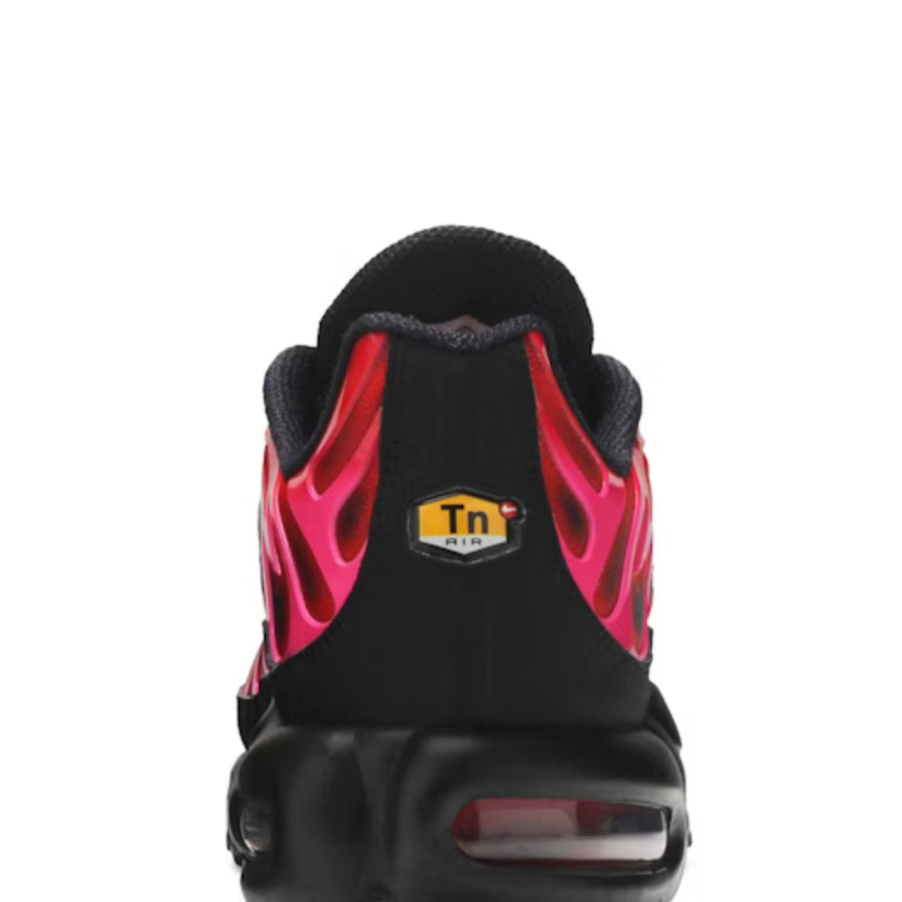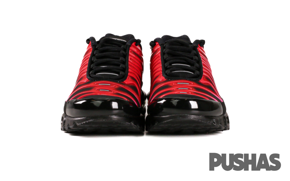 One of the three pairs in the pack: the Nike Air Max TN Plus x Supreme Black. The upper's usage of TPU technology is its most striking aspect. To further brand the runner, the TPU has been moulded to form the word "SUPREME." A pink and red colour gradient can be seen within the TPU. The classic style is completed with jewel-encrusted Supreme branding on the tongue, marking yet another successful partnership between the two companies.