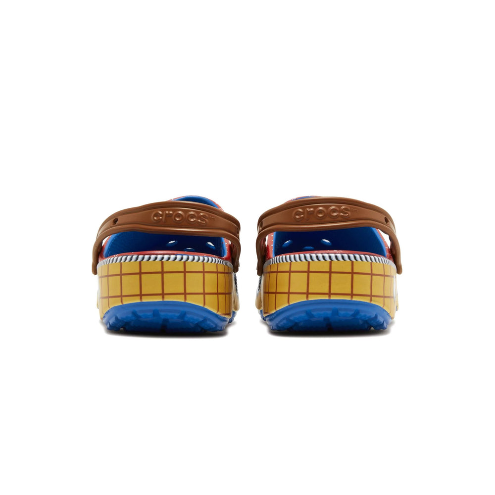 The Crocs Classic Clog x Toy Story 'Woody' (2024) features a distinctive design inspired by Woody’s iconic outfit. The clogs are adorned with a vibrant yellow base, echoing Woody's signature shirt, while the blue heel strap reflects the denim of his jeans. The standout feature is the detailed sheriff badge Jibbitz charm on each clog, a nod to Woody's role in the Toy Story series. The clogs are further accented with brown and red details, mirroring Woody's hat and bandana, creating a cohesive and instantly recognizable aesthetic.