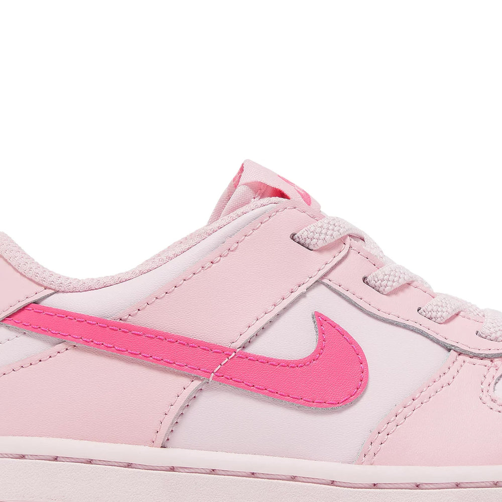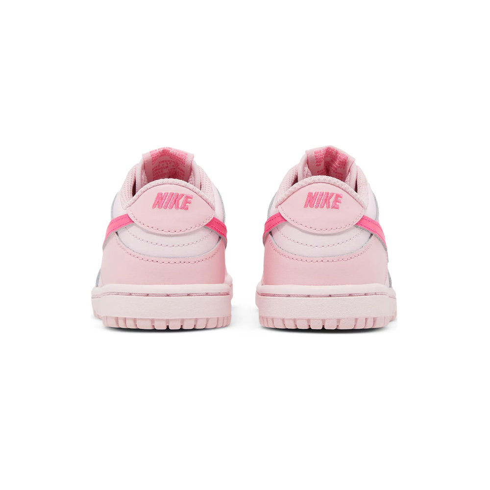 The Nike Dunk Low 'Triple Pink' TD is enveloped in a striking all-pink colorway that spans from the leather upper to the rubber outsole, creating a uniform and eye-catching appearance. The sneaker features a mix of soft and durable materials, including smooth leather overlays and a breathable mesh tongue, ensuring comfort and longevity for young wearers. The signature Nike Swoosh, also in pink, seamlessly blends into the design, maintaining the monochromatic theme while emphasizing brand identity. Padded collars and a cushioned midsole provide additional support and comfort, making this sneaker ideal for daily adventures.