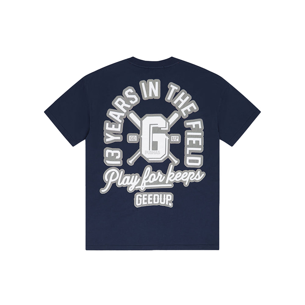 The Geedup 13YR Play For Keeps T-Shirt 'Navy White' features a classic navy colorway, with contrasting white typography emblazoned across the front, offering a bold and minimalistic look. The "Play For Keeps" slogan reinforces Geedup’s fearless attitude toward life and fashion. Crafted from premium cotton, this t-shirt ensures comfort and durability, perfect for both casual wear and active lifestyles. The relaxed fit and soft fabric make it versatile, providing all-day wearability without sacrificing style.