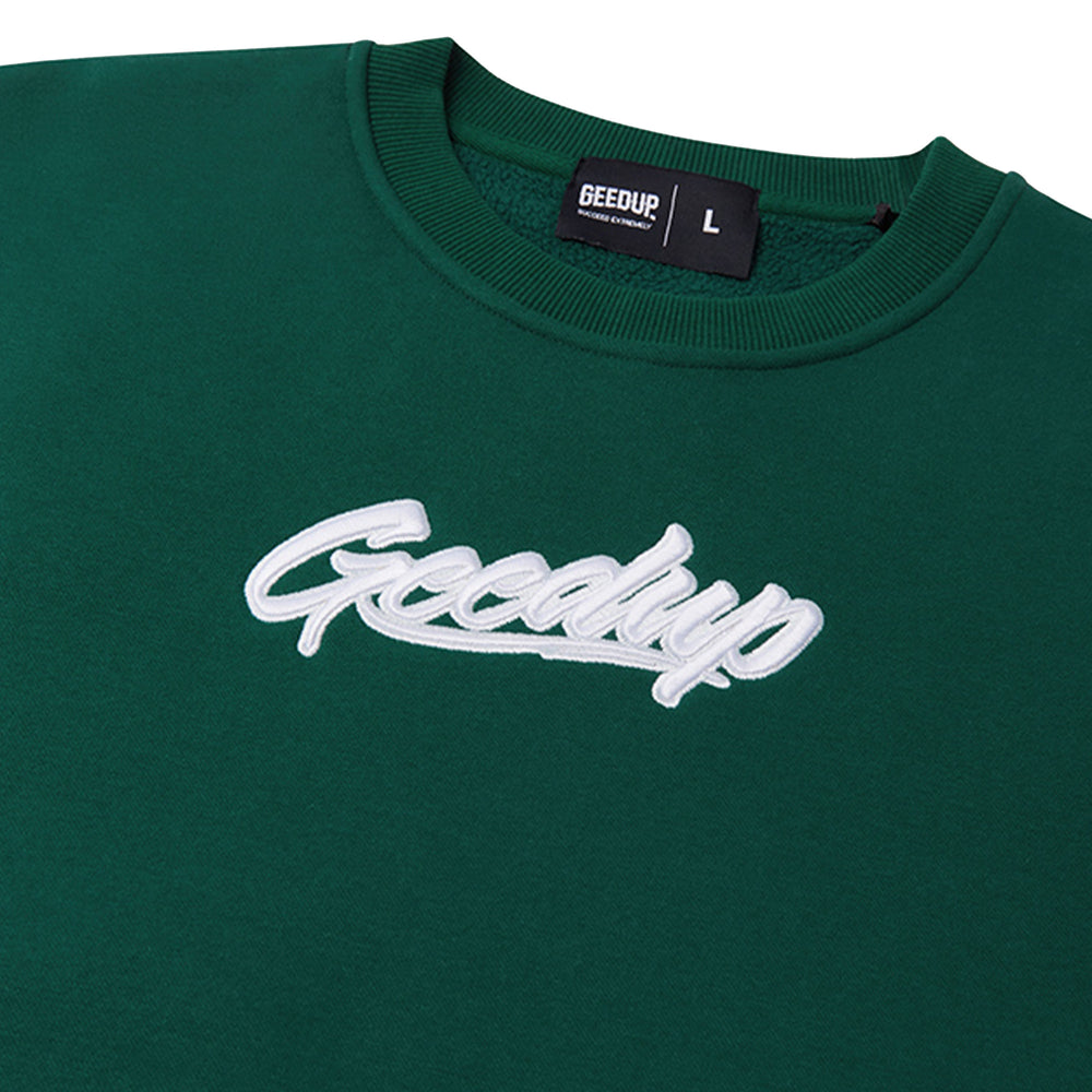 Constructed from premium heavyweight cotton, the Geedup OS Script Crewneck ensures warmth and comfort without compromising on breathability. The deep forest green hue serves as the perfect canvas for the crisp white Geedup script logo emblazoned across the chest, a subtle yet impactful statement of brand identity. Ribbed cuffs and hem provide a snug fit, while the crewneck design allows for easy layering over t-shirts or under jackets. This piece is meticulously crafted, reflecting Geedup's commitment to high-quality streetwear that stands the test of time.