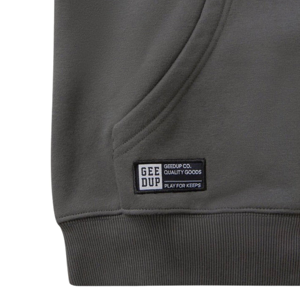 Crafted from premium heavyweight fleece, the Geedup Team Logo Hoodie 'Asphalt Grey' offers an exceptional blend of warmth and style. The hoodie features a meticulously embroidered Geedup logo on the chest, serving as a mark of authenticity and an emblem of urban sophistication. Its deep asphalt grey color provides a versatile foundation, complementing a wide range of outfits and ensuring it remains a staple piece through every season.
