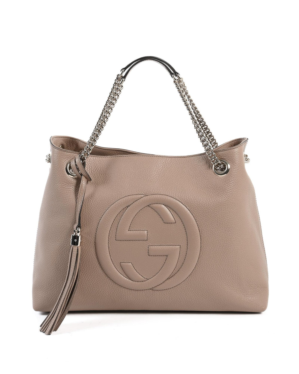 Indulge in the refined simplicity of the Gucci Leather Tote Bag 'Light Brown' in a graceful light brown hue. This Soho leather tote is a symbol of Gucci's timeless elegance, featuring the iconic logo embossed on the front for a subtle display of luxury. With its Italian heritage, this tote embodies the exquisite craftsmanship associated with Gucci. The bag's dimensions, 14.5 x 10.5 x 5.5 cm, provide a compact yet spacious interior to carry your essentials in style. The addition of a playful tassel accent on the side adds a touch of whimsy to this classic design. This 100% leather tote represents the perfect union of luxury and functionality, suited for both the busy streets and the chicest of soirées. Embrace the allure of Gucci and carry not just your belongings, but a piece of fashion history.