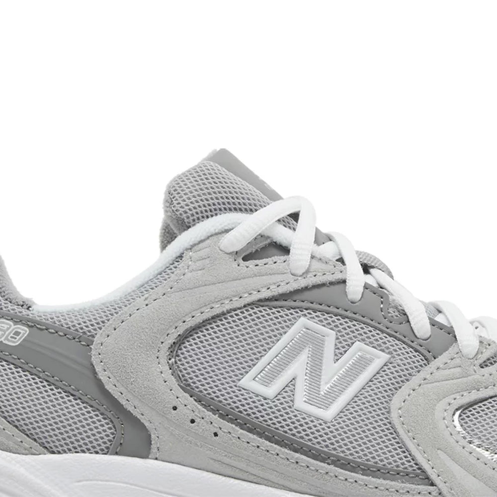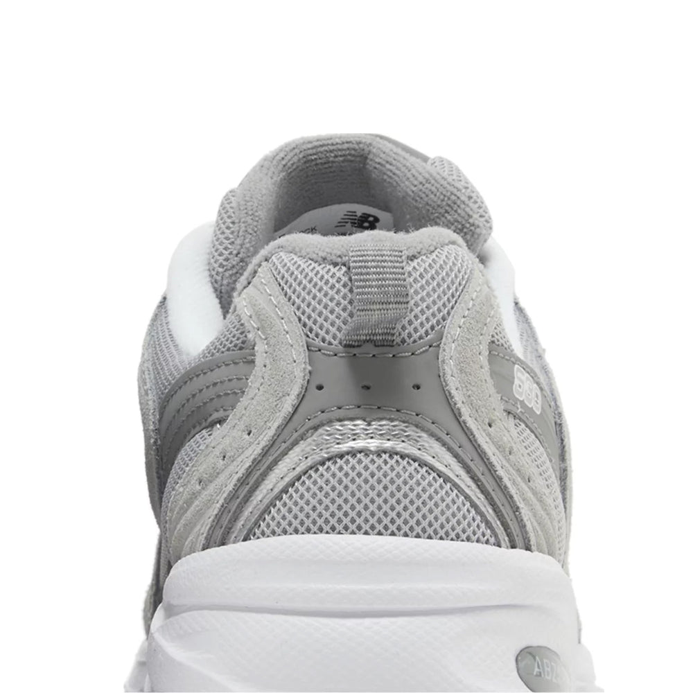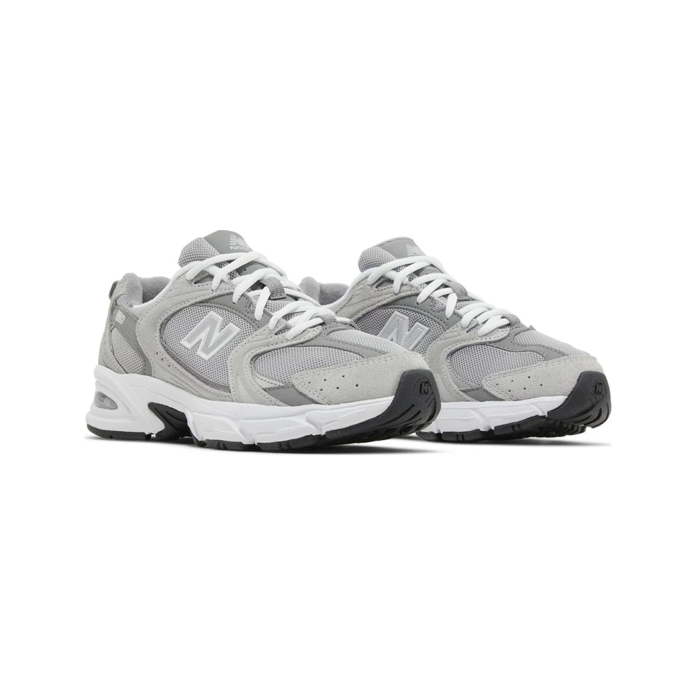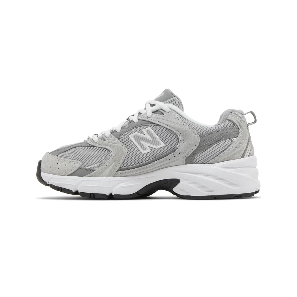 The New Balance 530 'Raincloud' features a sophisticated blend of materials, primarily constructed with a sleek mesh upper that is complemented by premium suede overlays. The colorway presents a muted palette of grey, reminiscent of a soft raincloud, allowing for easy pairing with various outfits. Subtle accents of navy and white pop throughout the design, including the iconic "N" logo and branding details on the tongue and heel. The cushioning technology, characteristic of New Balance, ensures maximum comfort, making this sneaker not just stylish but also practical for everyday wear. Additionally, the rubber outsole provides excellent traction, enhancing the sneaker's functionality.