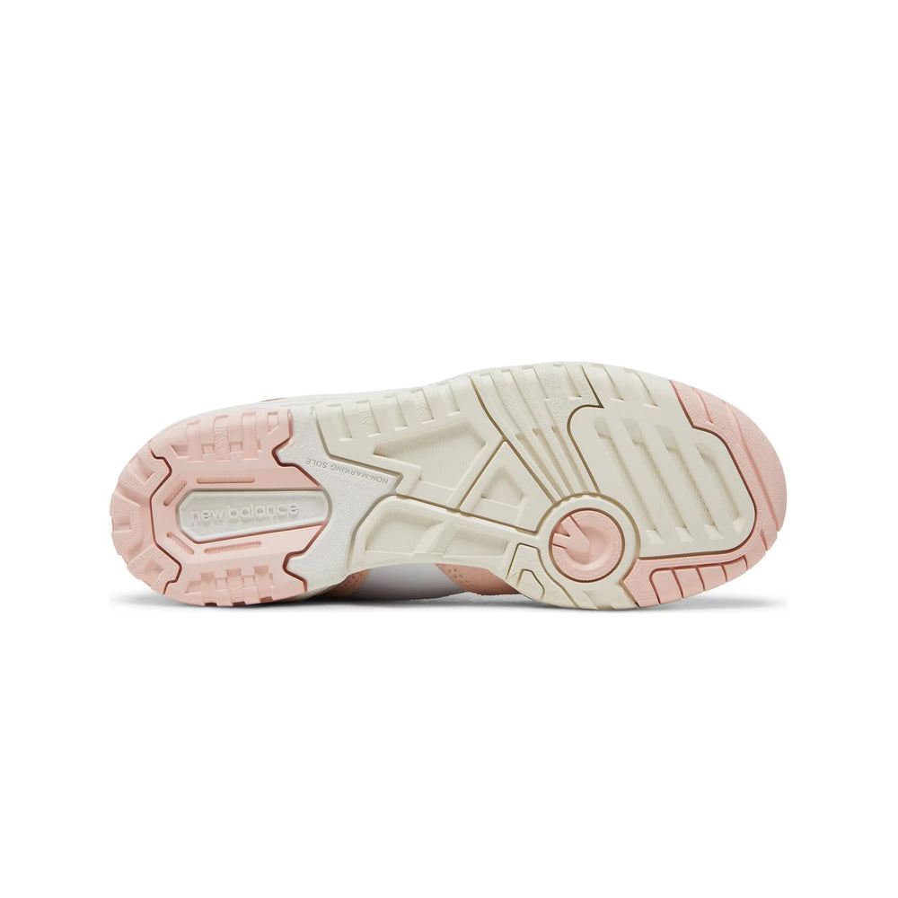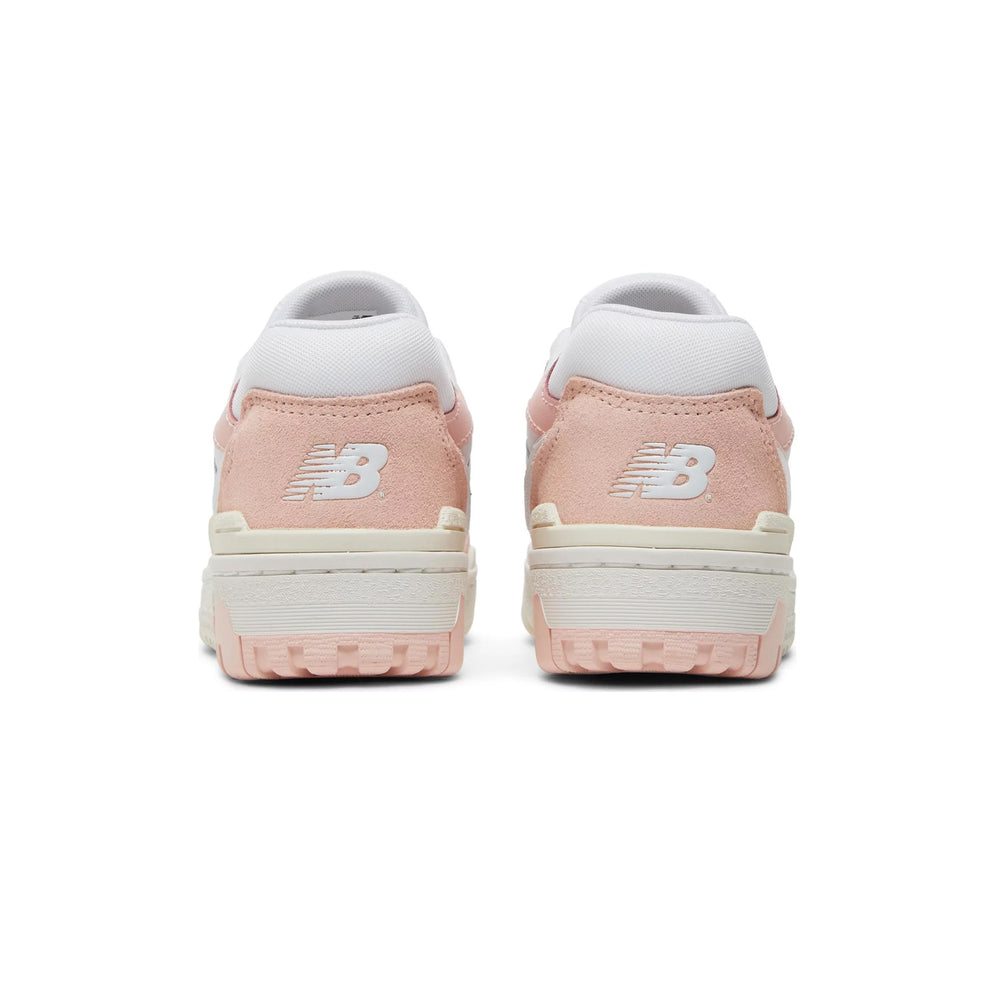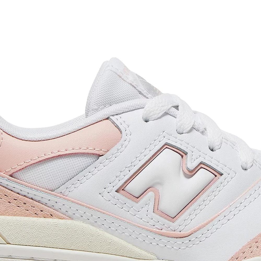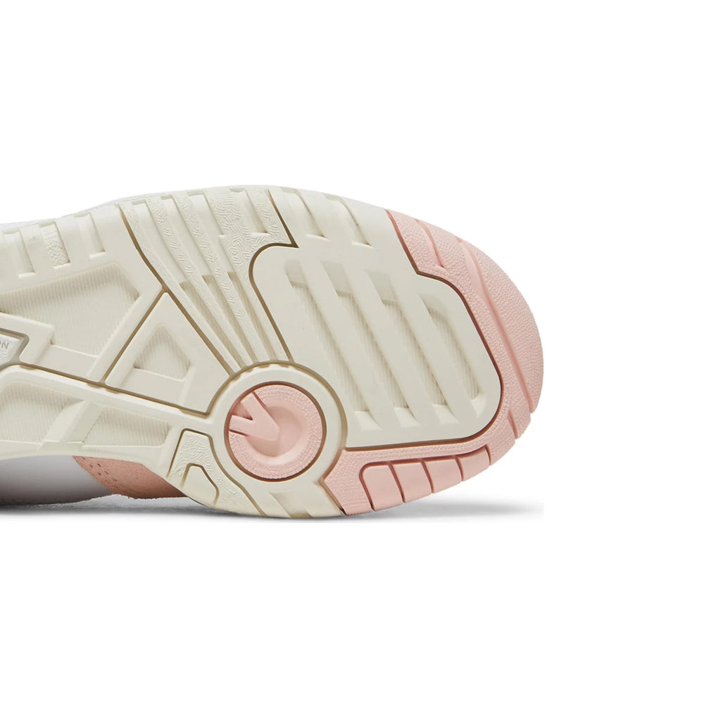 Crafted with a predominantly white leather upper, the sneaker is punctuated by subtle pink accents that add a playful yet sophisticated touch. The overlays in 'Sea Salt' hues provide a tasteful contrast, enhancing the overall visual appeal. The New Balance branding is prominently featured on the tongue, side panel, and heel, ensuring brand visibility without overpowering the design. The midsole, also in white, offers reliable cushioning, making these sneakers perfect for everyday wear. The rubber outsole, designed for durability, features a tread pattern that ensures optimal traction, whether on the court or the streets.