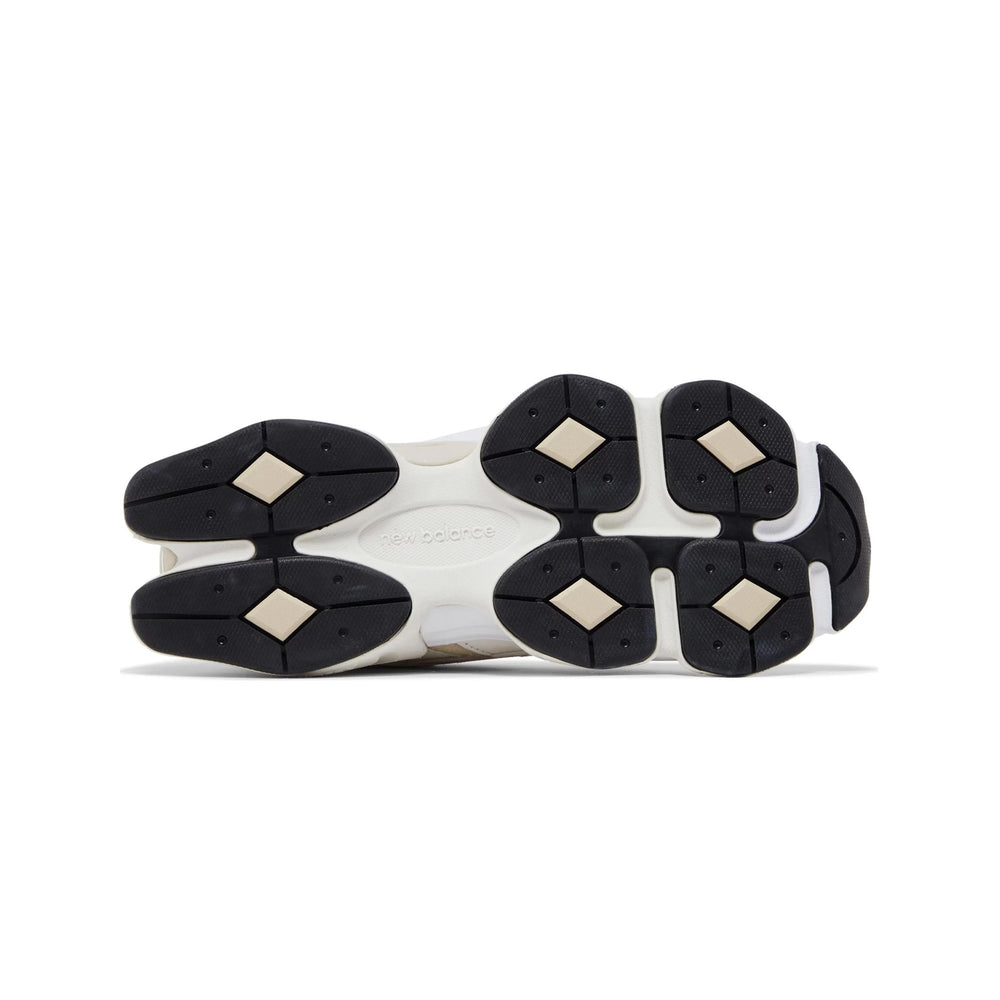 The sneaker's sole unit is a standout feature, incorporating New Balance’s signature ABZORB and SBS cushioning technologies. This combination provides exceptional shock absorption and stability, making the 9060 'Turtledove' suitable for both casual wear and athletic activities. The rubber outsole, with its intricate tread pattern, ensures optimal grip and traction across various surfaces.