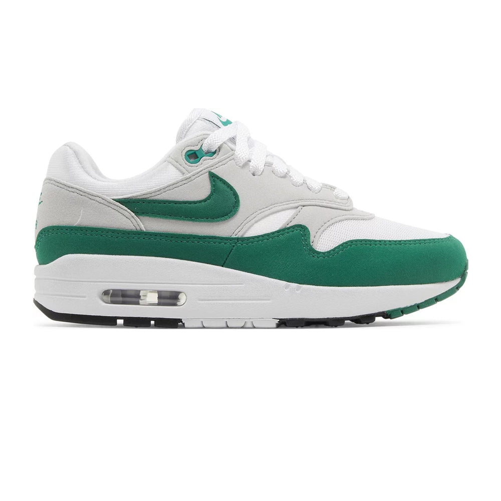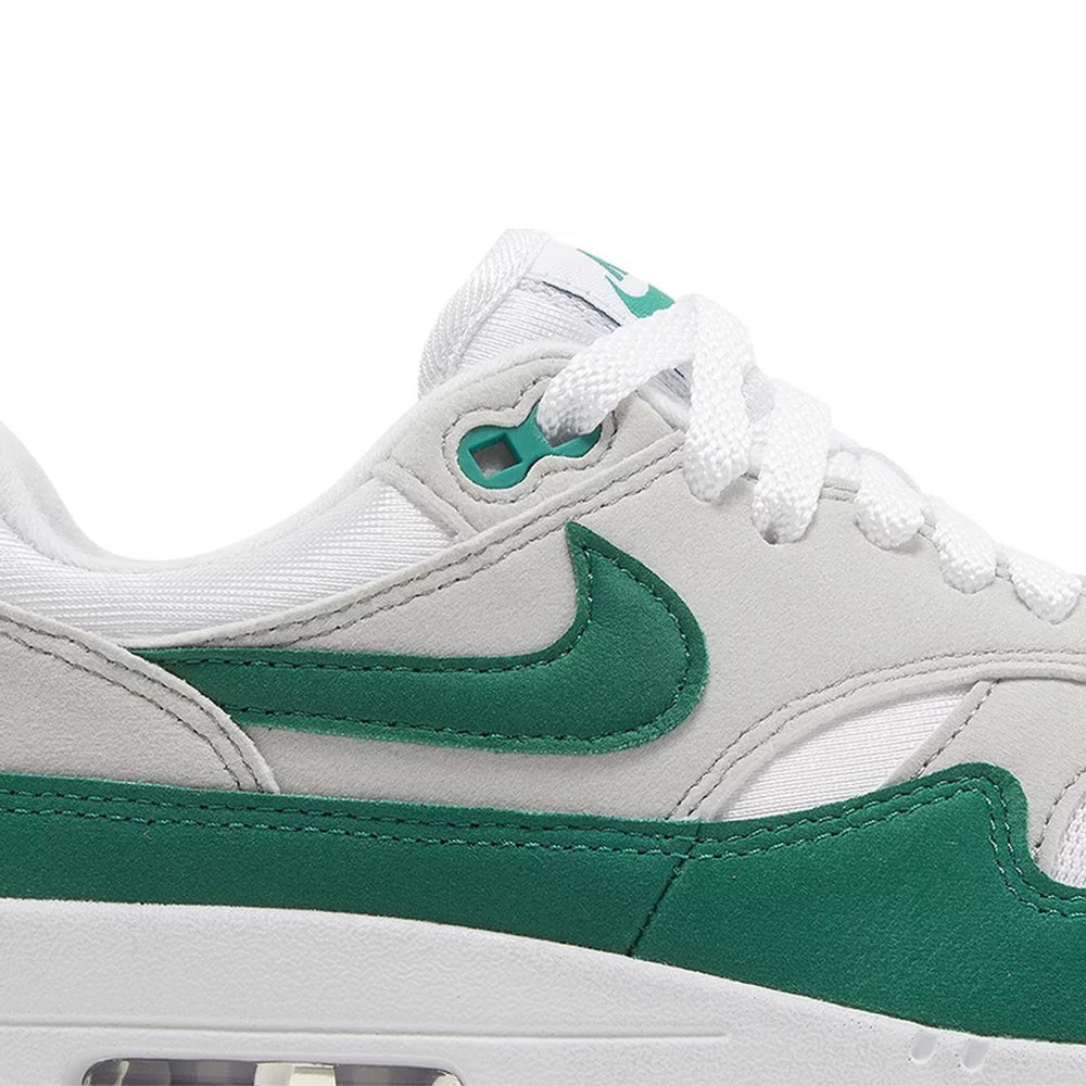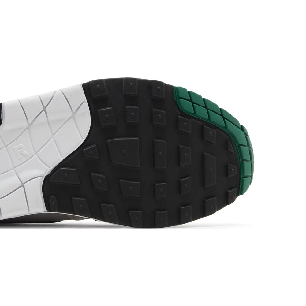 The Nike Air Max 1 '87 'Malachite' Women's edition features a crisp white mesh upper, complemented by sleek "Malachite" green leather overlays that wrap around the mudguard and eyelets. A striking contrast is provided by the deep black Swoosh, creating an eye-catching look that highlights the shoe’s elegant design. The visible Air Max unit in the midsole remains a staple, delivering both comfort and heritage. Meanwhile, a gum rubber outsole adds an element of durability and style, making this sneaker versatile for both streetwear and active lifestyles. Whether you’re drawn to its iconic design or its bold, modern updates, the Air Max 1 '87 'Malachite' ensures you stand out.
