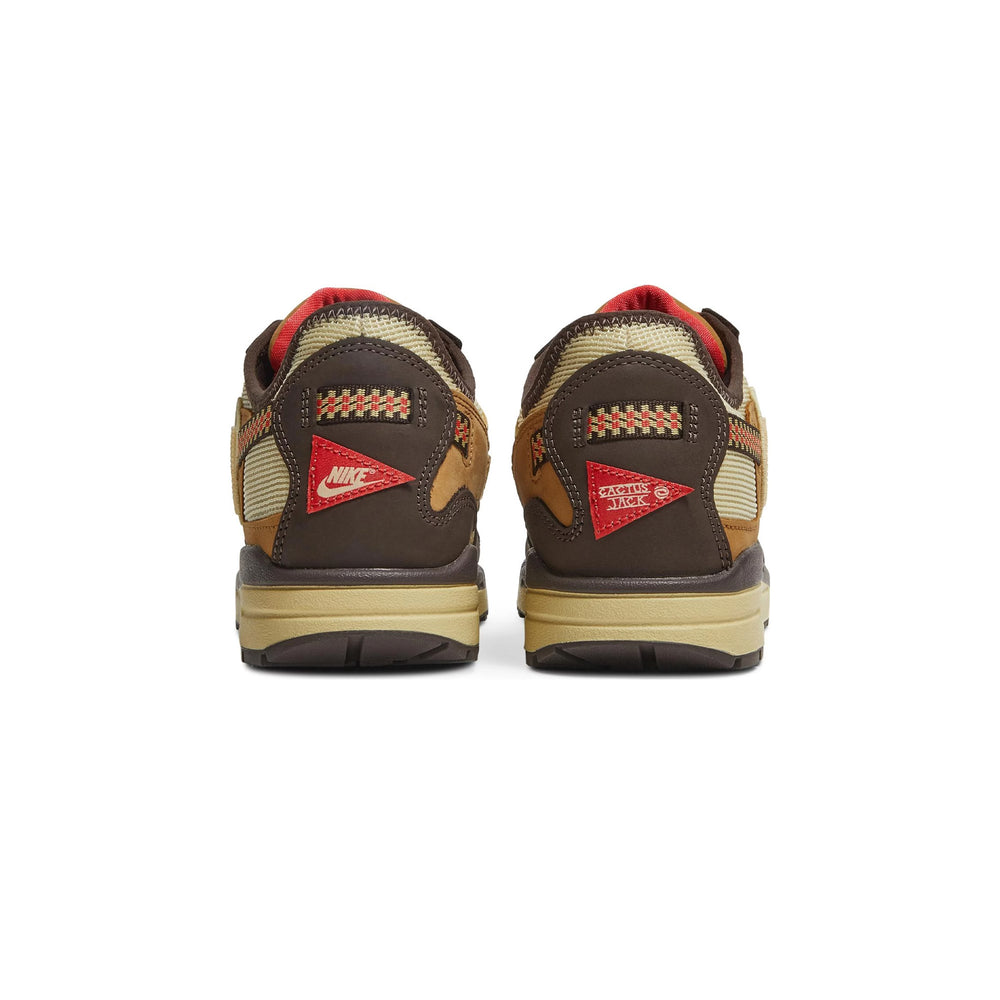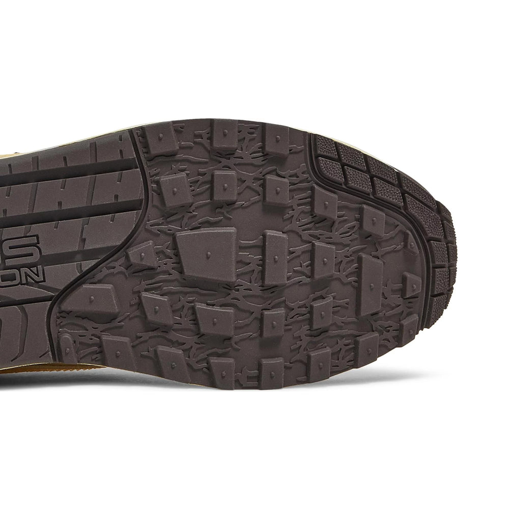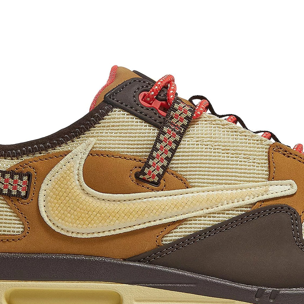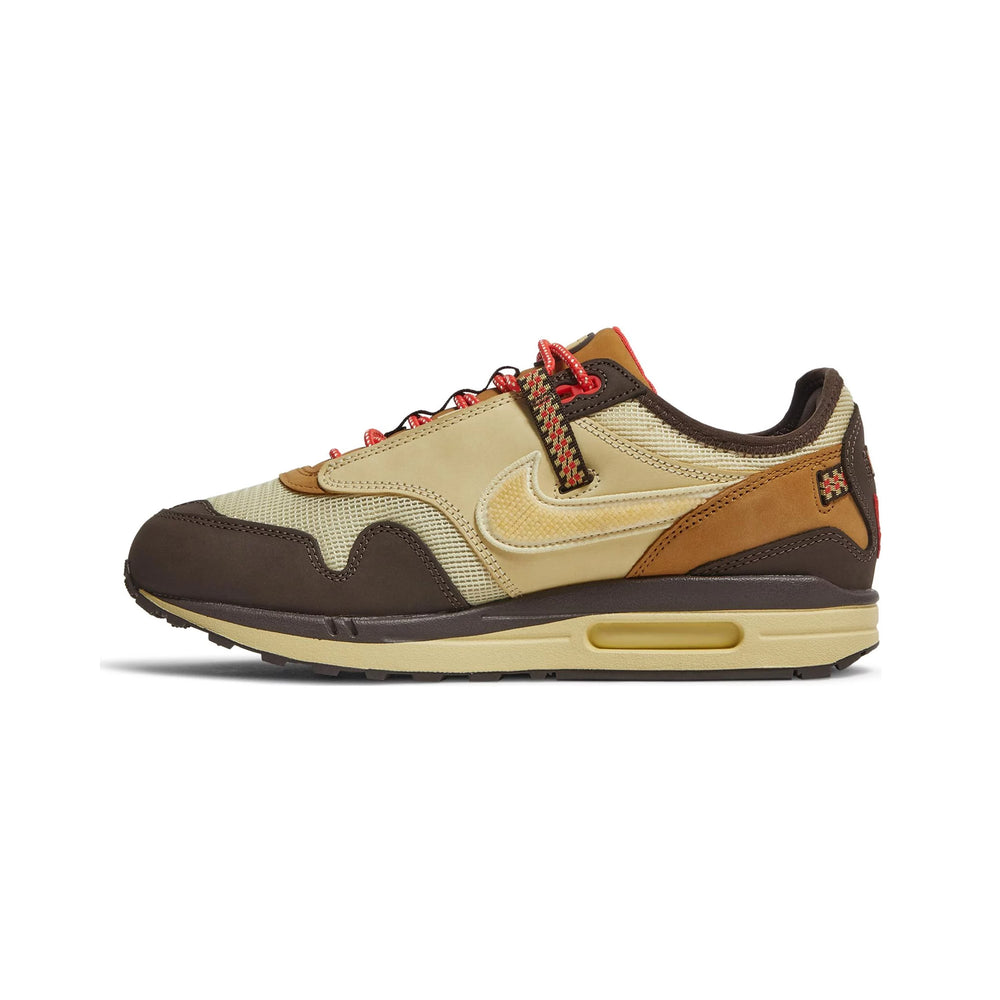 The 'Baroque Brown' edition of the Nike Air Max 1 showcases a mixed-material upper that fuses mesh, suede, and leather for a tactile, layered appearance. A "Baroque Brown" base sets the tone for the design, complemented by "Wheat" and "Lemon Drop" overlays that enhance the sneaker's rugged look. Travis Scott's signature reverse Swoosh appears prominently in "Cactus Jack" style, adding a bold twist to the lateral sides. Rope-style laces and heavy-duty eyelets further emphasize the outdoorsy theme, while the midsole, finished in a speckled off-white, highlights the iconic Air cushioning. Subtle branding details, like Cactus Jack logos on the tongue and heel, round out the design, making this release a must-have for sneaker collectors and Travis Scott fans alike.