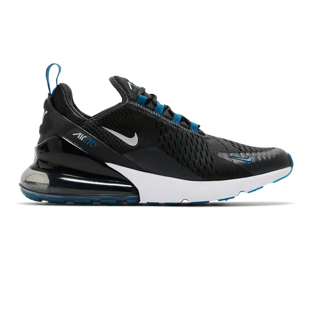 The Nike Air Max 270 'Anthracite Industrial Blue' (2023) delivers a fresh take on the iconic Air Max lineage, combining bold industrial aesthetics with cutting-edge comfort. This release stands out with its striking color palette and the signature 270-degree Air unit, making it a must-have for sneaker enthusiasts and casual wearers alike. Overview The sneaker features a dominant "Anthracite" mesh upper, providing lightweight breathability and a sleek, modern look. Contrasting "Industrial Blue" accents highlight the heel tab, Swoosh branding, and midsole, offering a vibrant pop against the dark base. A transparent Air Max 270 unit in the heel enhances cushioning and visual appeal, showcasing Nike’s innovative approach to comfort and design. The lightweight foam midsole and durable rubber outsole ensure all-day wearability. With its perfect blend of style and function, the Nike Air Max 270 'Anthracite Industrial Blue' is a versatile choice for both athletic and lifestyle use. Key Highlights • Striking 'Anthracite Industrial Blue' Colorway: Combines a dark, understated upper with vivid blue accents for a bold yet versatile aesthetic. • Innovative Air Max 270 Heel Unit: Provides superior cushioning and a standout look with 270 degrees of visible Air technology. • Durable and Comfortable Construction: Features a breathable mesh upper, lightweight foam midsole, and rubber outsole for long-lasting performance.