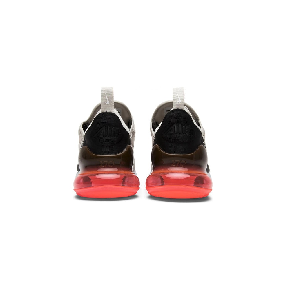Featuring a muted "Light Bone" upper, the Air Max 270 stands out with its striking "Hot Punch" accents. The engineered mesh upper delivers breathability and a comfortable fit, while the large, visible Air Max unit in the heel provides superior cushioning and impact protection. This model introduces a contemporary twist with its dynamic color placement, highlighted by the vibrant "Hot Punch" hue on the tongue, laces, and heel tab, juxtaposed against the neutral base. The sleek, modern silhouette is complemented by a streamlined midsole and an EVA foam base for enhanced comfort and durability. Nike’s signature branding is subtly integrated, enhancing the overall refined aesthetic.